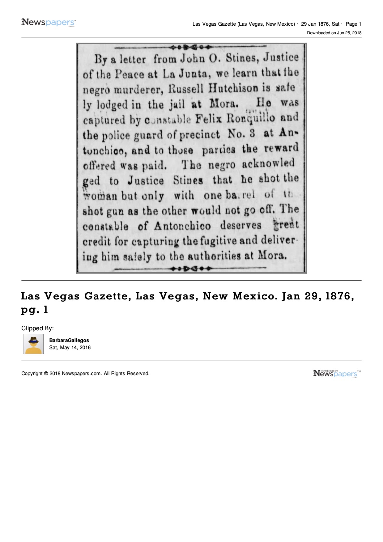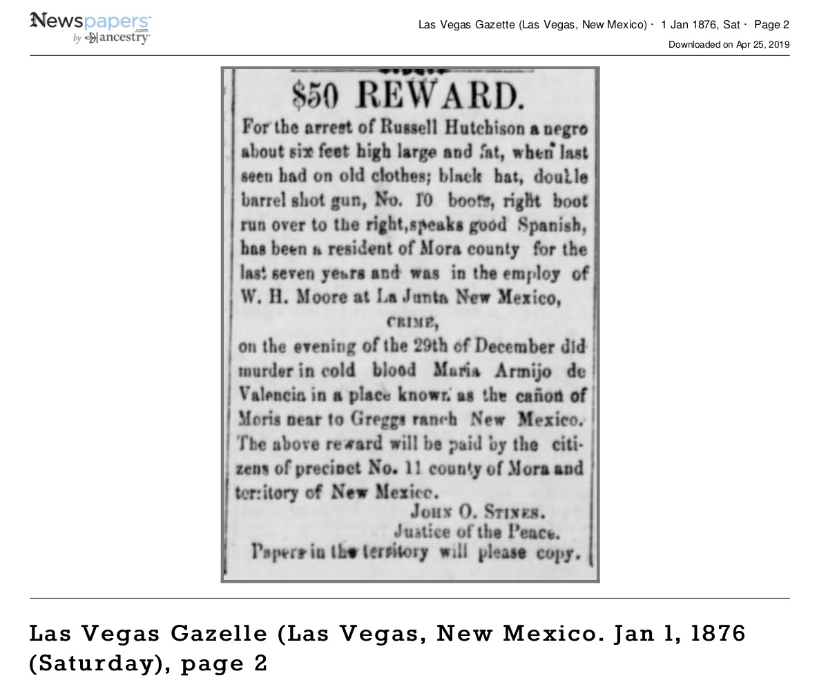 Death of a wife | Maria ARMIJO December 29, 1875 Note: Maria Armijo was murdered by her neighbor Russell Hutchison's shotgun blast.