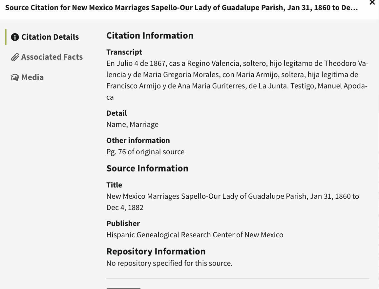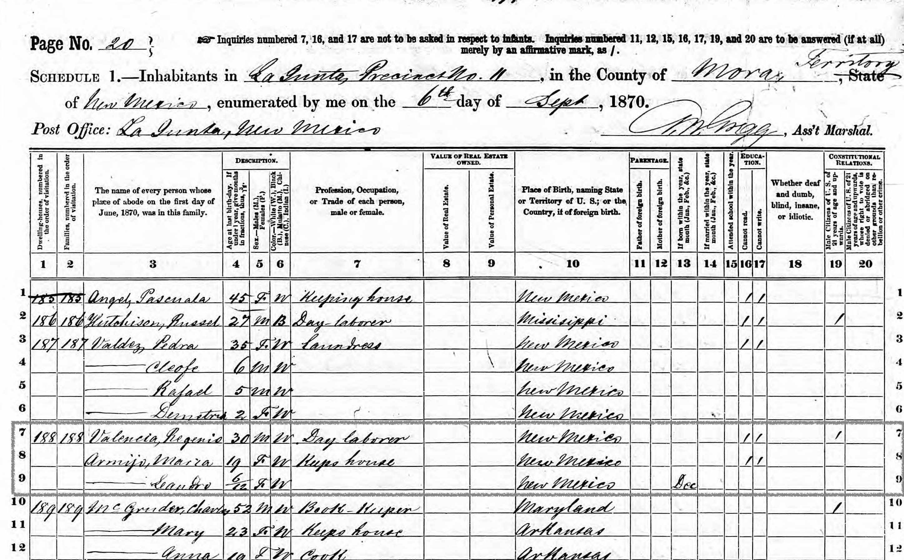 | Census | Regenio Valencia 30 born New Mexico Maria Armijo 19 born New Mexico Leandra Valencia 6/12 born Dec, New Mexico |