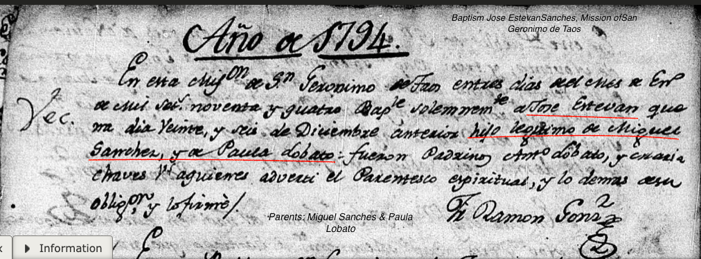 Jose Estevan SANCHES Baptism: January 3, 1794 36 30 — Mission of San Geronimo de Taos, Taos, New Mexico |