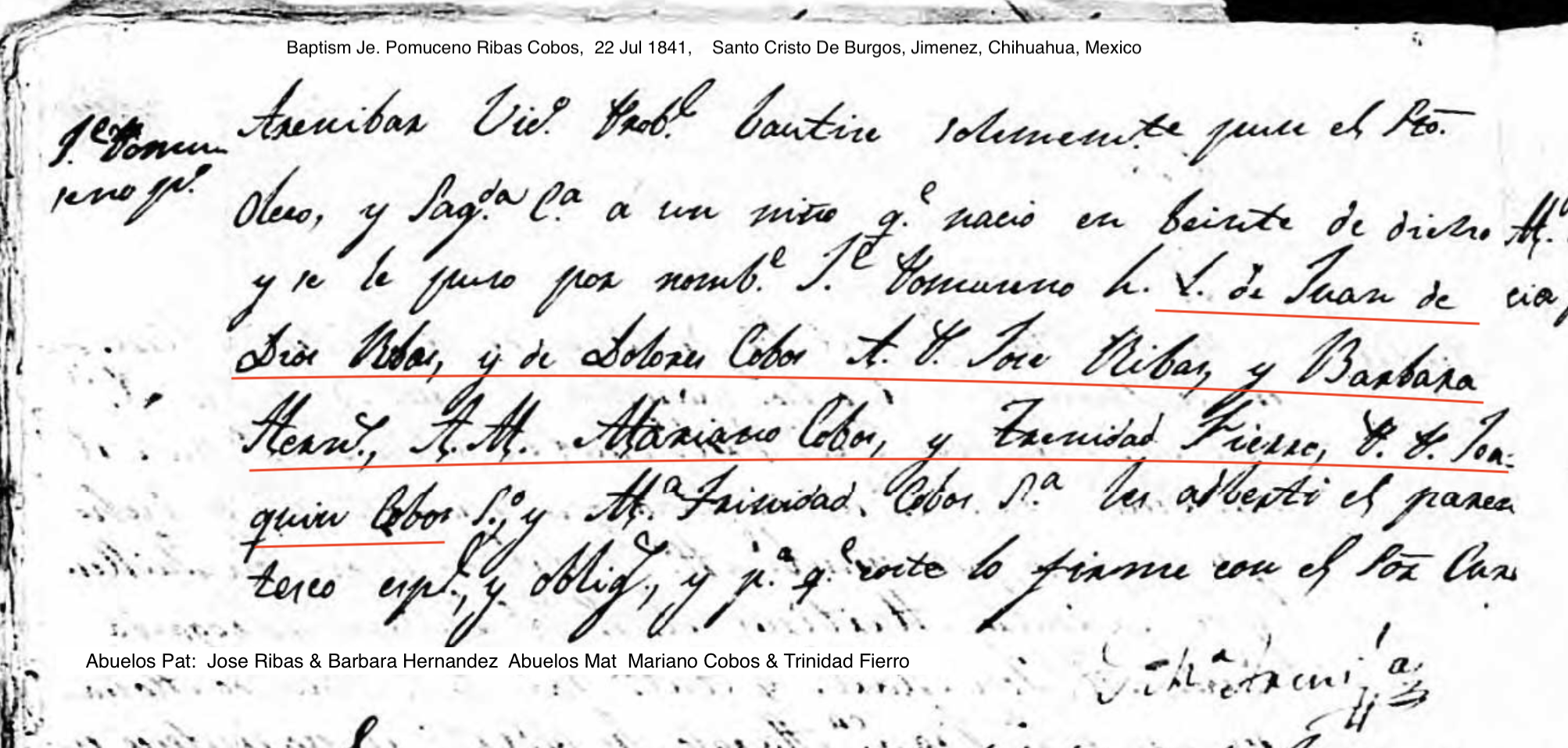 Jose Francisco Santiago RIBAS COBOS Baptism: November 29, 1835 — Santo Cristo de Burgos, Jimenez, Chihuahua, Mexico Death: April 29, 1890 — Jimenez, Chihuahua, Mexico |