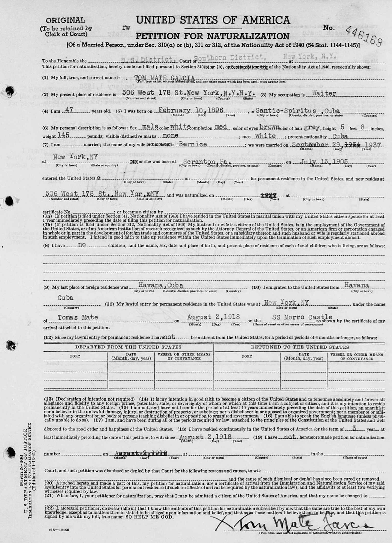 | Naturalization | Petitions for Naturalization filed in New York City, 1792-1989 Name: Tom Mate Garcia Birth Date: abt 1896 Age: 47 Naturalization Date: 16 Jun 1943 Residence: New York, New York Title and Location of Court: New York Southern District |