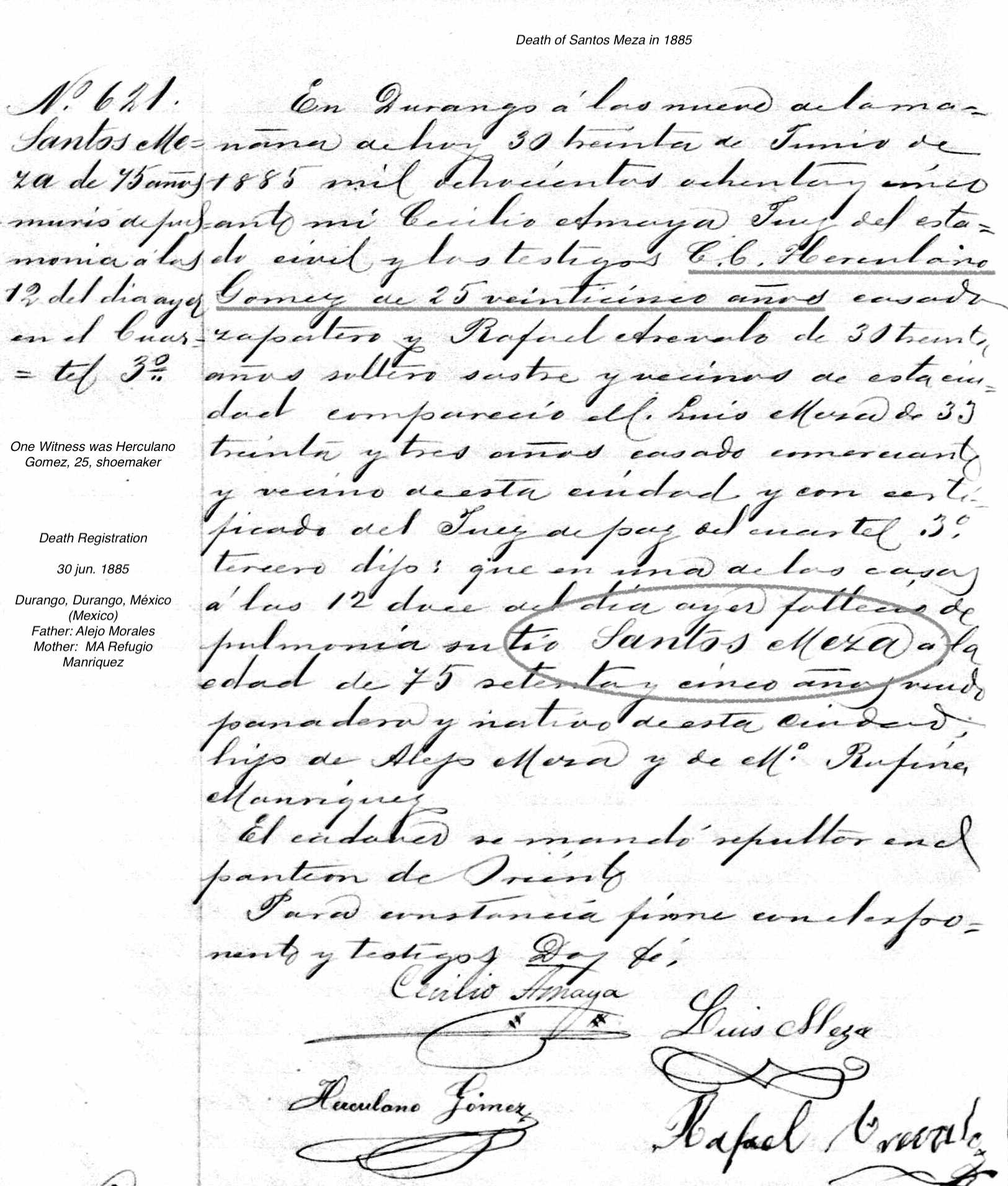 Death of a maternal grandfather | Santos MESA June 30, 1885 (Age 19 years) Age: 72 |