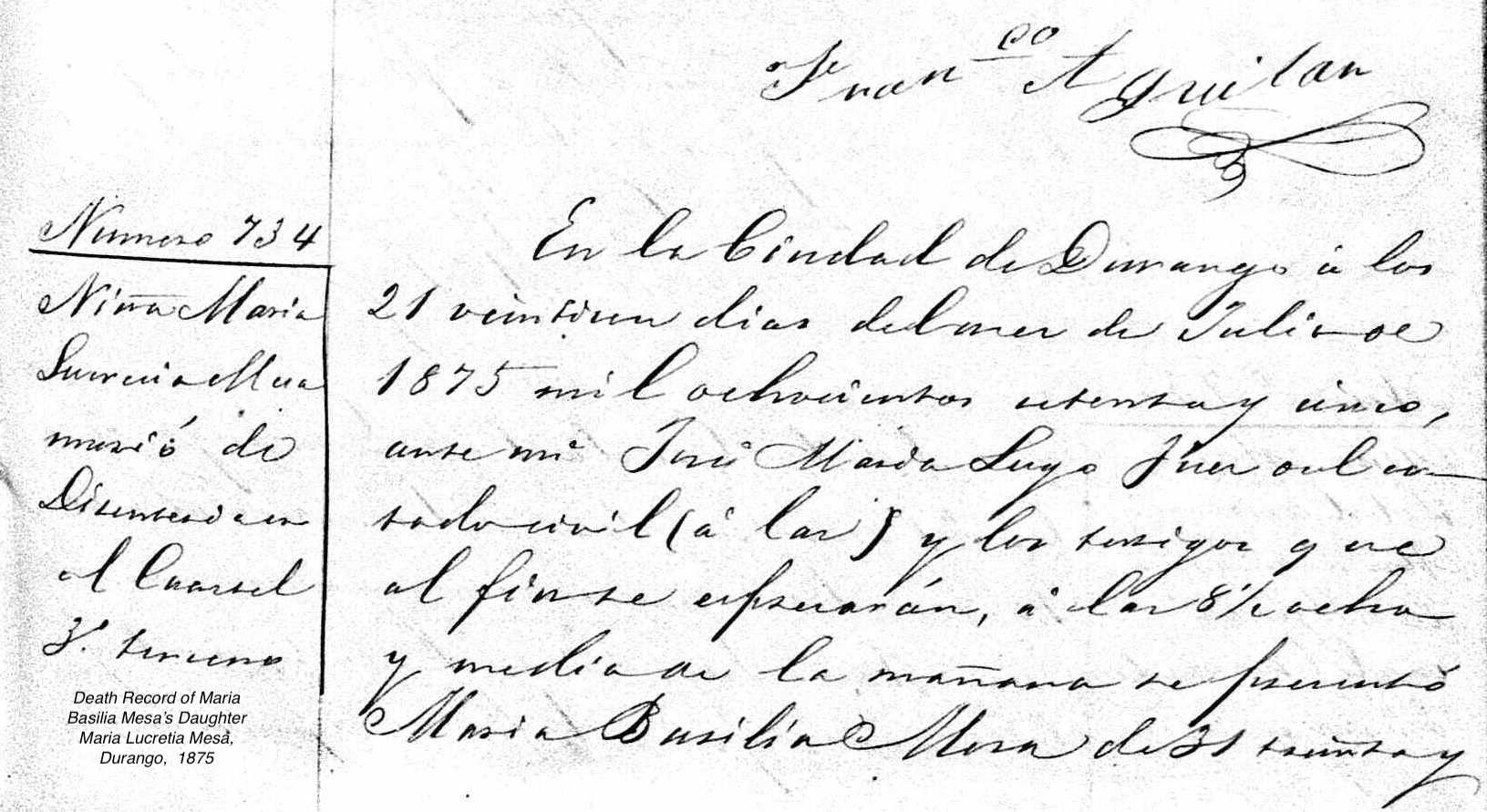 | Death | Durango, Mexico, Civil Registration Deaths For Maria Lucrecia Mesa Gender: Mujer (Female) Age: 2 Birth Year: abt 1873 Death Registration Date: 21 jul. 1875 Death Registration Place: Durango, Durango, México (Mexico) Father: Miguel Gomez Mother: Maria Basilia Mesa Page Number: 27 One witness to the death was Santos Mesa, Basilis's father, who was declared to be "55 years old, widower, baker" . |