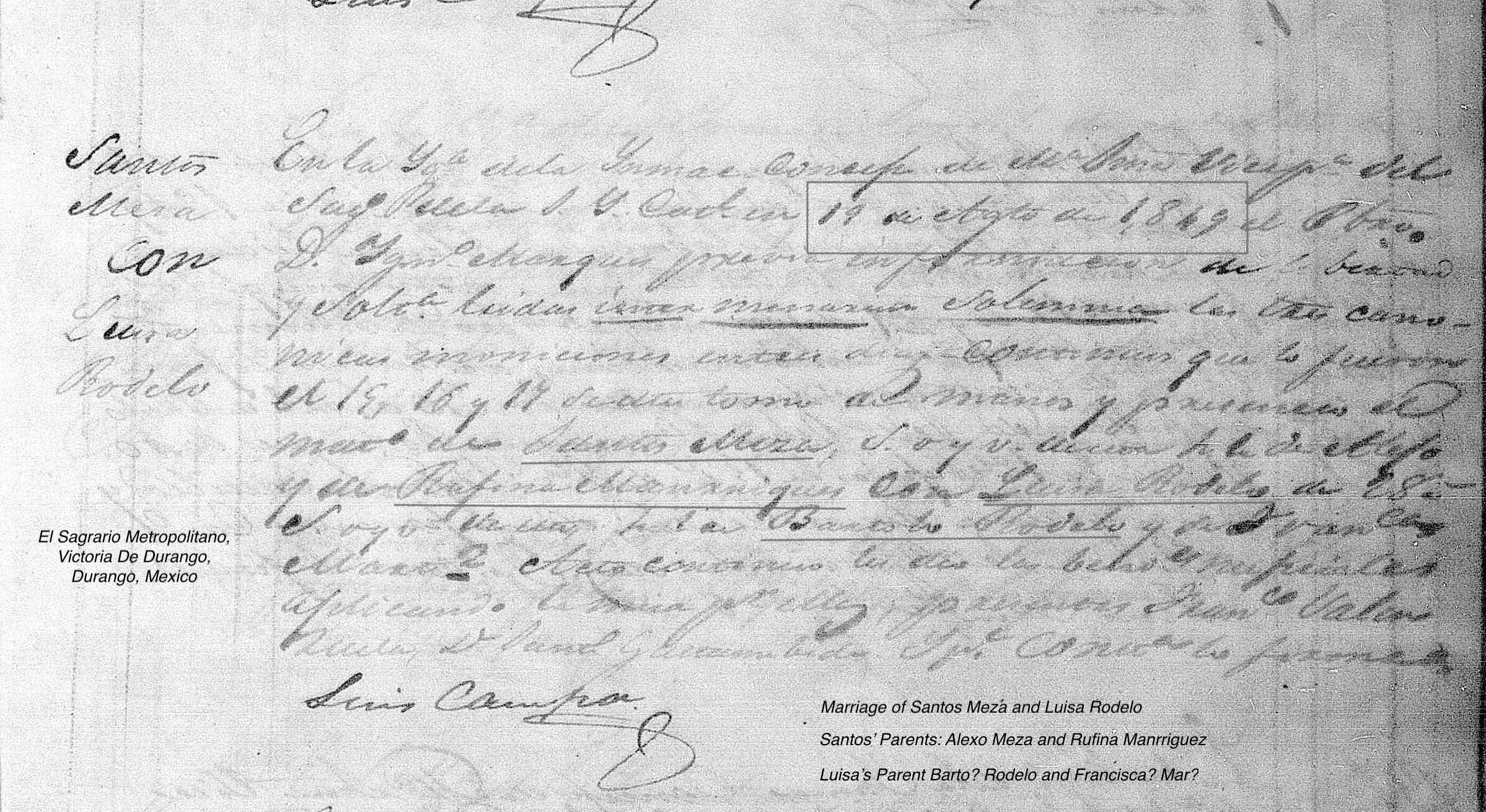 Religious marriage | Santos MESA — View this family August 19, 1849 (Age 28 years) 1849 Marriage Record For Santos Mesa and Luisa Rodelo Note: The record names Alexo Meza and Rufina Manrriguez as his parents and Bartolome Rodelo and Francisca Martinez as hers.