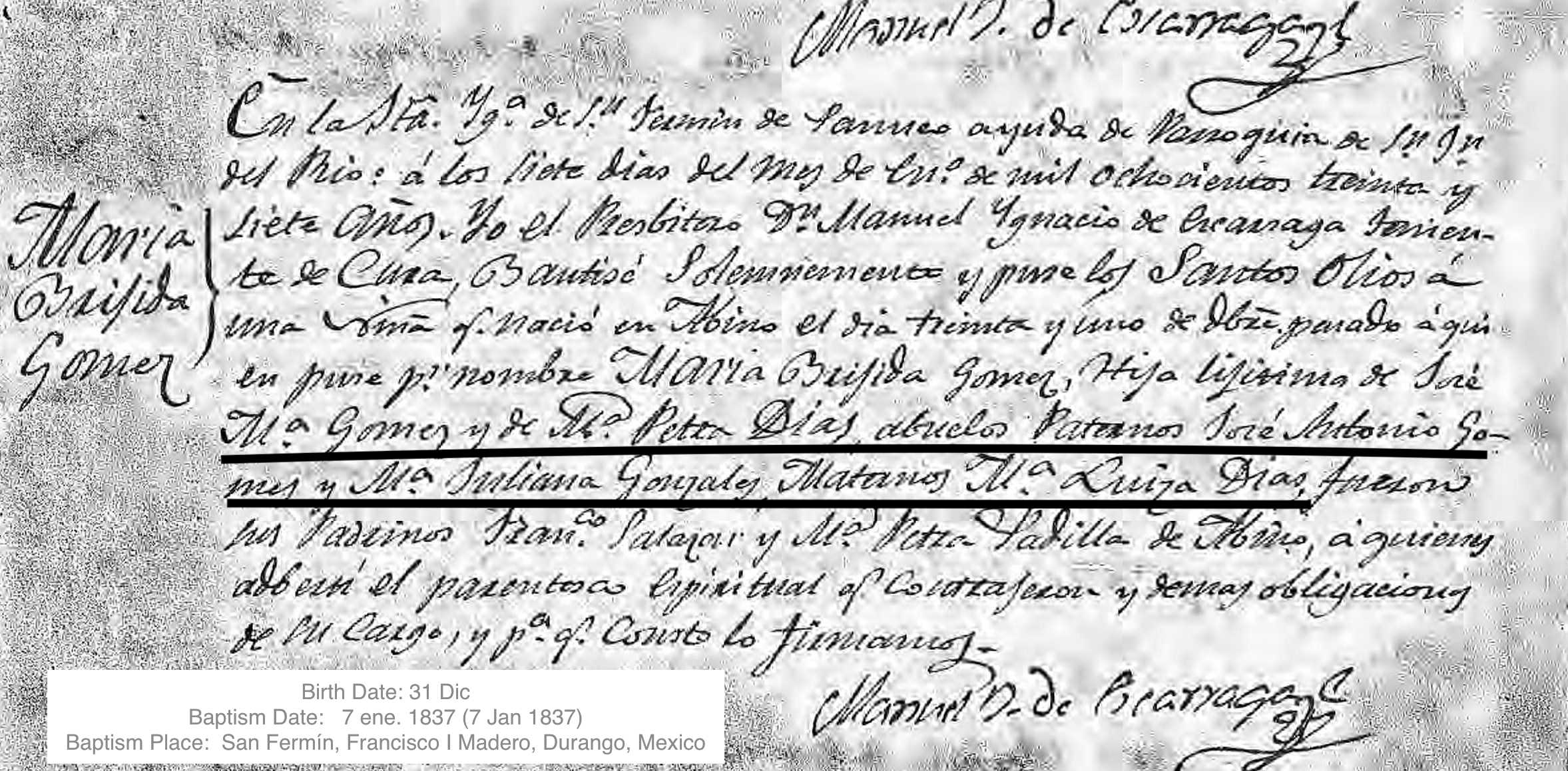 Maria Venita GÓMEZ DIAZ Baptism: April 7, 1817 27 — San Fermin De Panuco, Francisco Madero, Durango, Mexico |