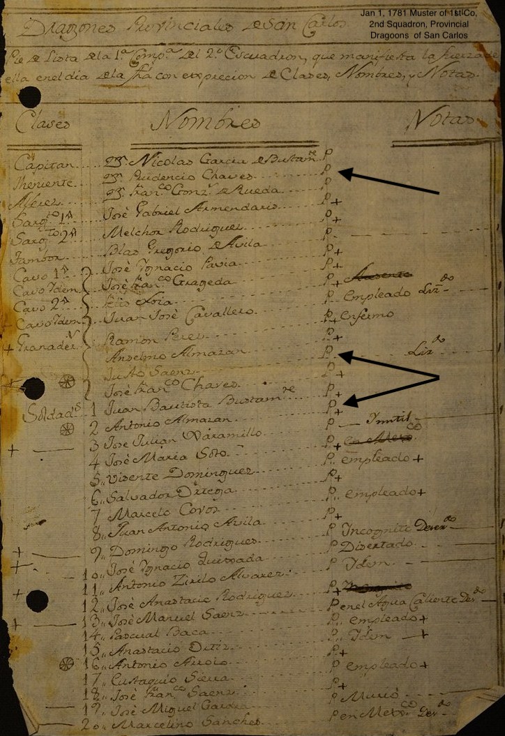 Muster of the San Carlos Dragoons, Jan 1, 1781 Note: In 1781 there were 3 family members in the 1st Co, 2nd Squadron of the San Carlos Dragoons. Anselmo Almasan and Antonio Almasan were sons of Rufino Almasan & Ysabel de Chavez. Don Prudencio Chaves was Ysabel's brother, and son of Francisco Xavier de Chavez of Nuevas Minas.