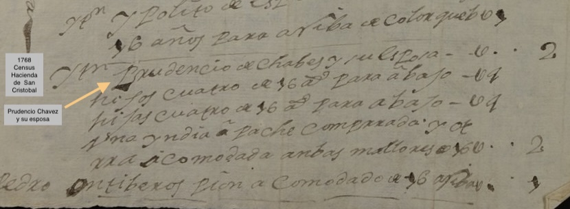 | Census | Hazienda de Sn Chripxtobal N 774 Prudencio Chavez caveza de familia Español cassado de 50 años Anna Franco su muger Española de 42 años 2 ... hijos solteros de 18 y 16 años 2 ... hijas doncellas de 13 y 12 años 2 ... sirvtes Mestisos de 17 y 14 años años 2 ... sirvientas Yndias doncellas de 31 y 21 |
