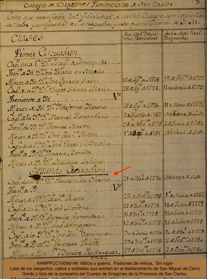 Military | Dragones Provinciales de San Carlos 1770 (Age 42 years)Note: Prudencio de Chavez was already a squadron leader in the Dragones de San Carlos by 1778.