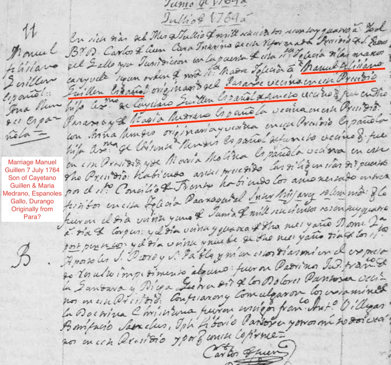 Marriage | Manuel GUILLEN — View this family July 7, 1764 Note: The marriage entry states that Manuel and Cayetano Guillen were natives of Pasaje - the Presidio de Nuestra Señora del Pasaje, where Cayetano's name appears in muster records of 1723.