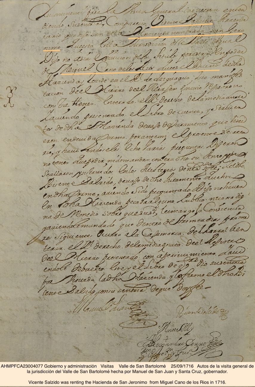 In 1716 Miguel Cano Still Owned Hacienda San Geronimo Note: Miguel still owned the hacienda but was renting it to Vicente Salzido.