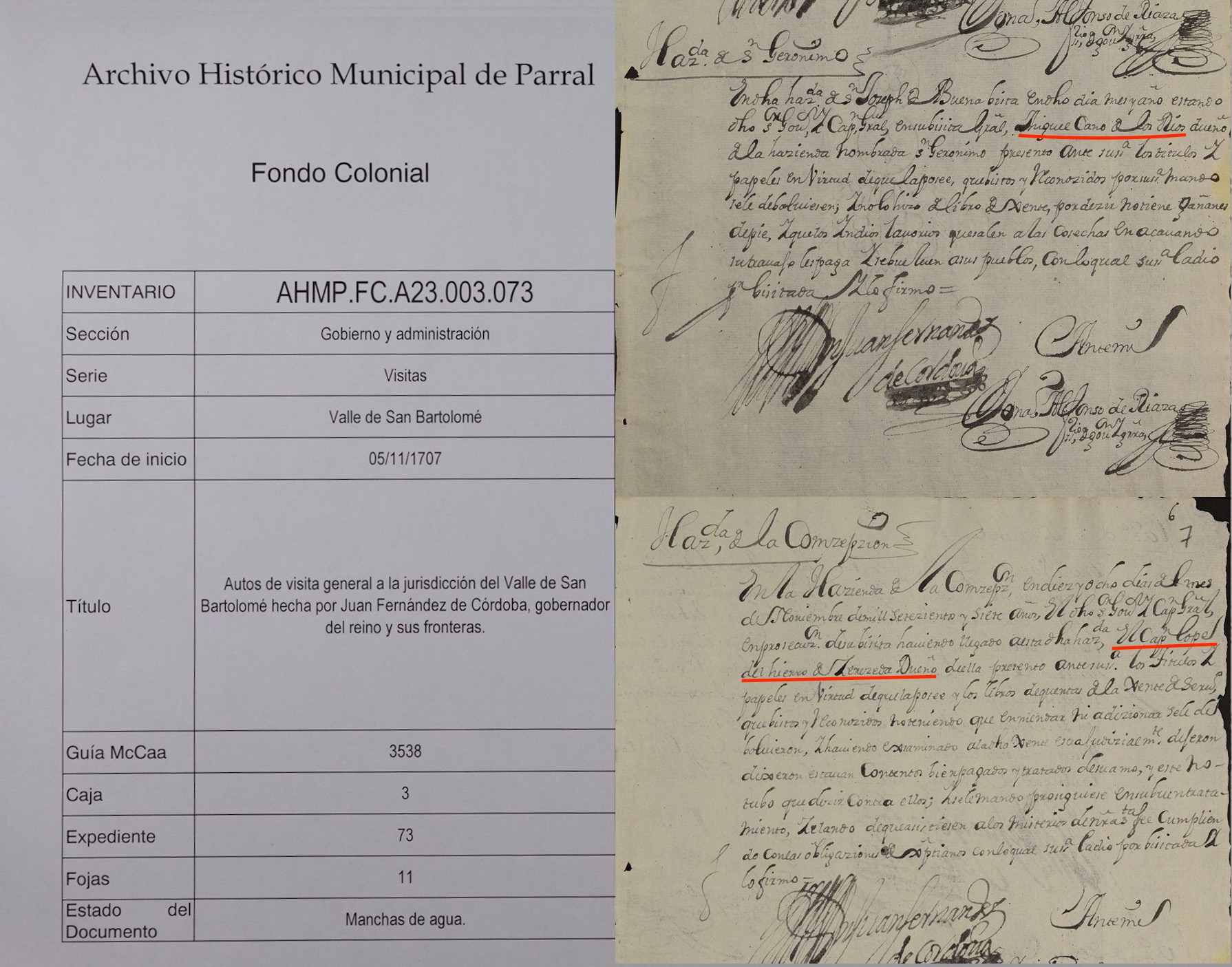 | Fact | Archive del Parral Index 2285 271 Sobre propiedad de las aguas de San Julian por Maria Dominguez contra Miguel Cano. 7 ff. D-113 Año 1702 |