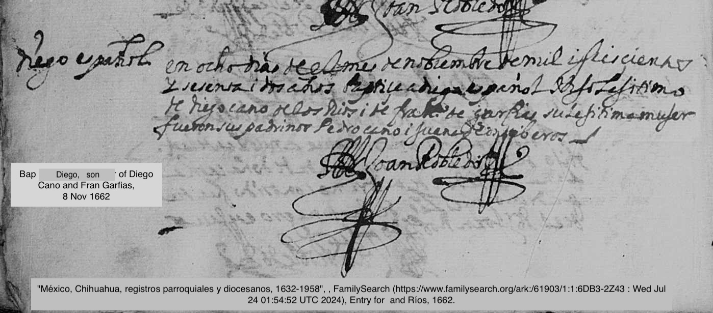 Diego CANO GARFIAS Baptism: November 8, 1662 34 25 — San Jose, Hidalgo del Parral, Chihuahua, Mexico |