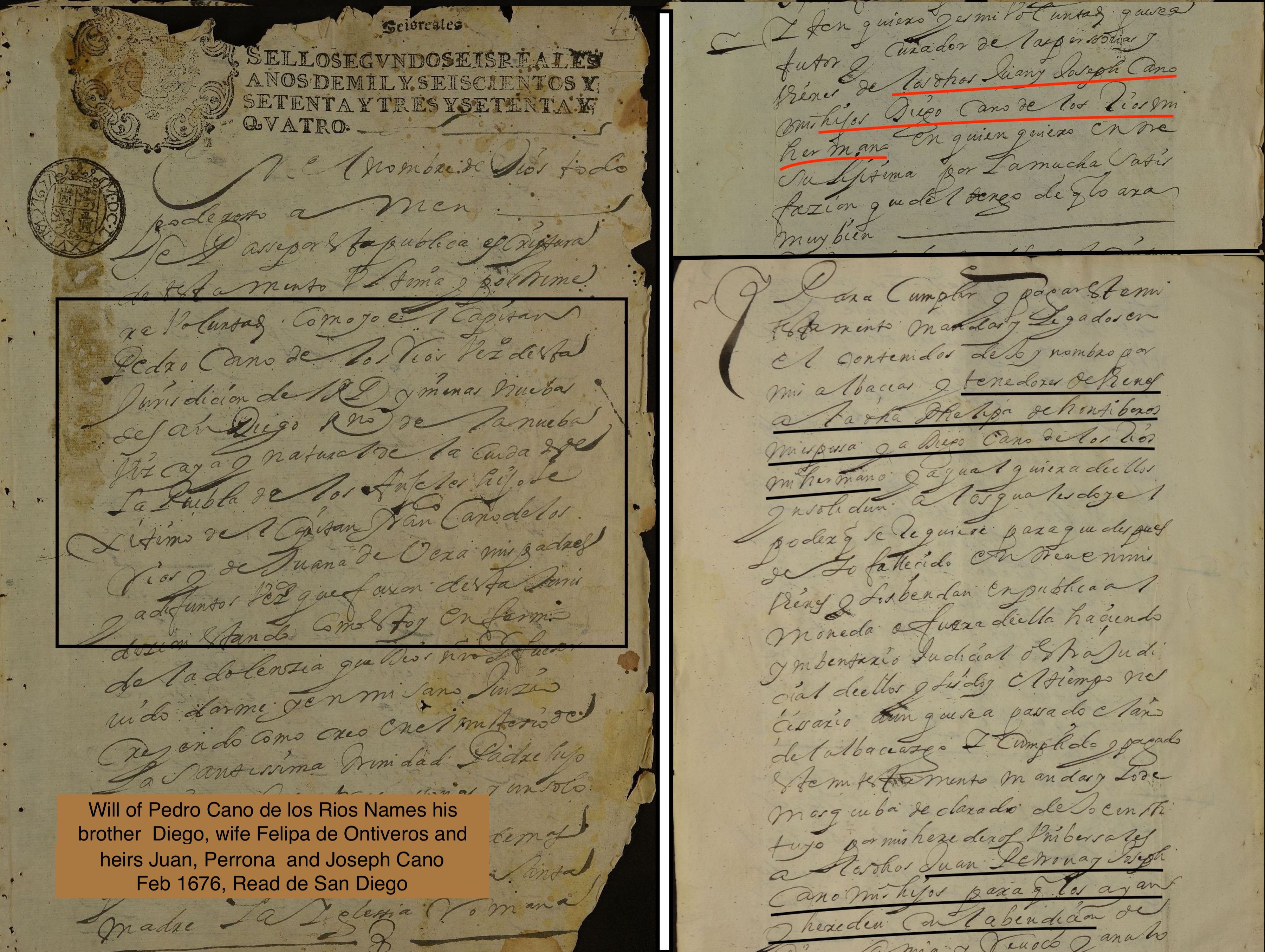 | Death | UAir Collections › Documentary Relations of the Southwest › Biofile CANO DE LOS RIOS, PEDRO BID Number 4158 Birth N.D.: PUEBLA DE LOS ANGELES Death 1675 May 19: SAN DIEGO Occupation 1675: SAN DIEGO/VECINO, CAPT. 1651 Jun 17: PARRAL/30 PESOS CONTRIBUTION TO GOVT.1653 - 1655: PARRAL/MERCHANT 1656 Jan 01: SAN DIEGO/ALCALDE ORDINARIO, MERCHANT Ethnicity CRIOLLO Family CANO DE LOS RIOS, FRANCISCO (F) (CAPT.) VERA, JUANA DE (M) CANO, JUAN (SN) CANO, PETRONA (DR) GOMEZ, XTOBAL (SNL) (MARRIED TO CANO, PETRONA) CANO, JOSEPH (BR) CANO DE LOS RIOS, DIEGO (BR) Marriage N.D.: SAN DIEGO/GONZALEZ, MARIA Notes JUNE 17, 1651 -CONTRIBUTION GIVEN BY HIM AND FATHER, FRANCISCO JANUARY 1, 1656 - ELECTED "DIPUTADO DEL SEGUNDO VOTO". Second Marriage N.D.: SAN DIEGO/ONTIBEROS, PHELIPA DE Source WILL AND TESTAMENT, PRIMARY SOURCE Sources AZU, FILM 318, PARRAL 1676 C, FR. 1765-1773 |