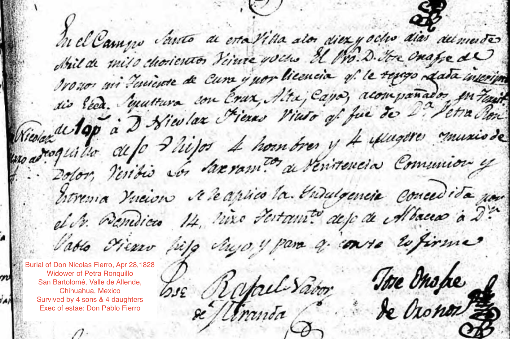 Jose Nicolas FIERRO Birth: about 1757 57 27 — Rio Conchos, Chihuahua, Mexico Burial: April 18, 1828 — San Bartolome, Valle De Allende, Chihuahua, Mexico |