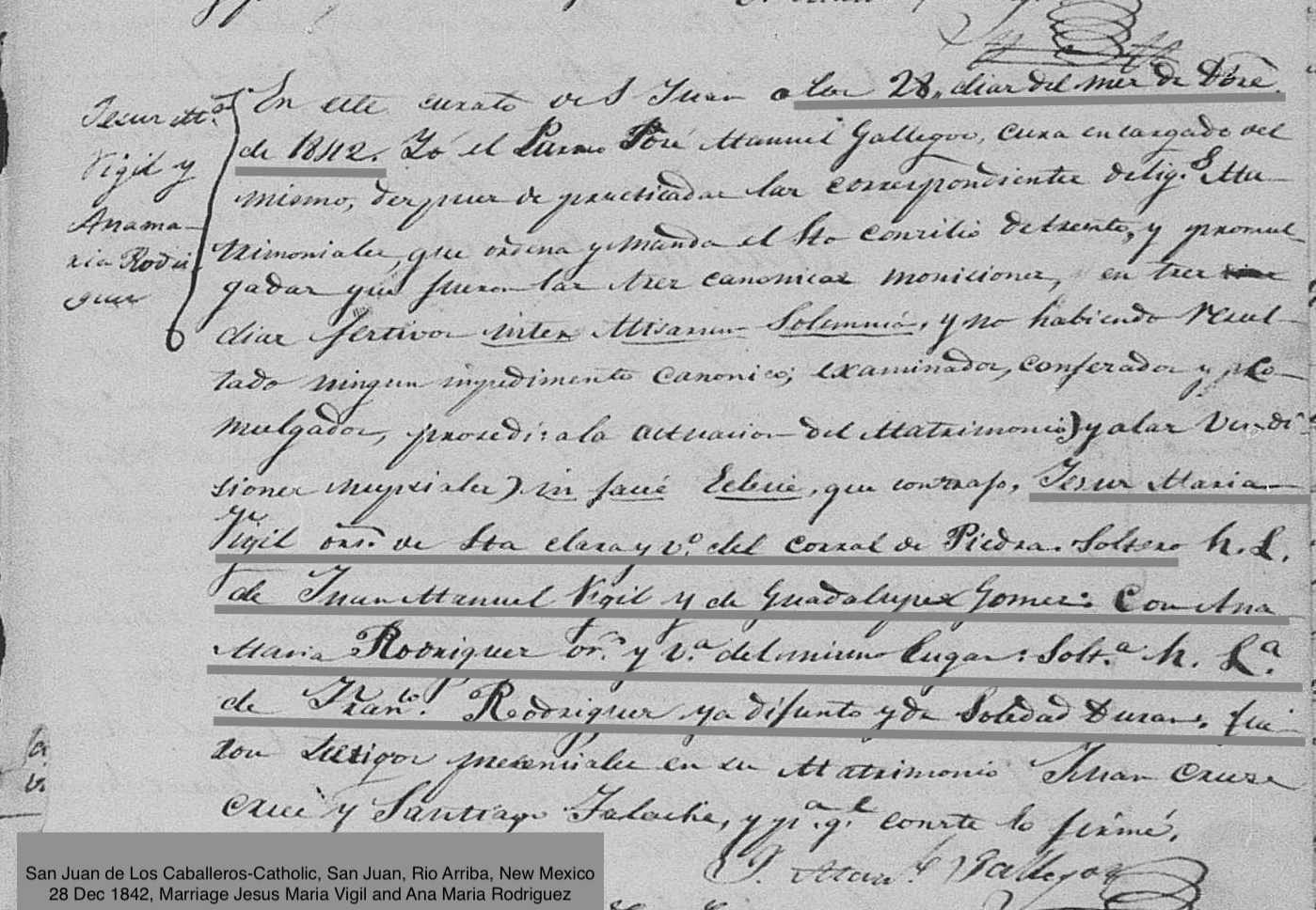 Marriage of a child | Jesus Maria VIGIL — Ana Maria RODRIGUEZ — View this family Type: Religious marriage December 28, 1842 |