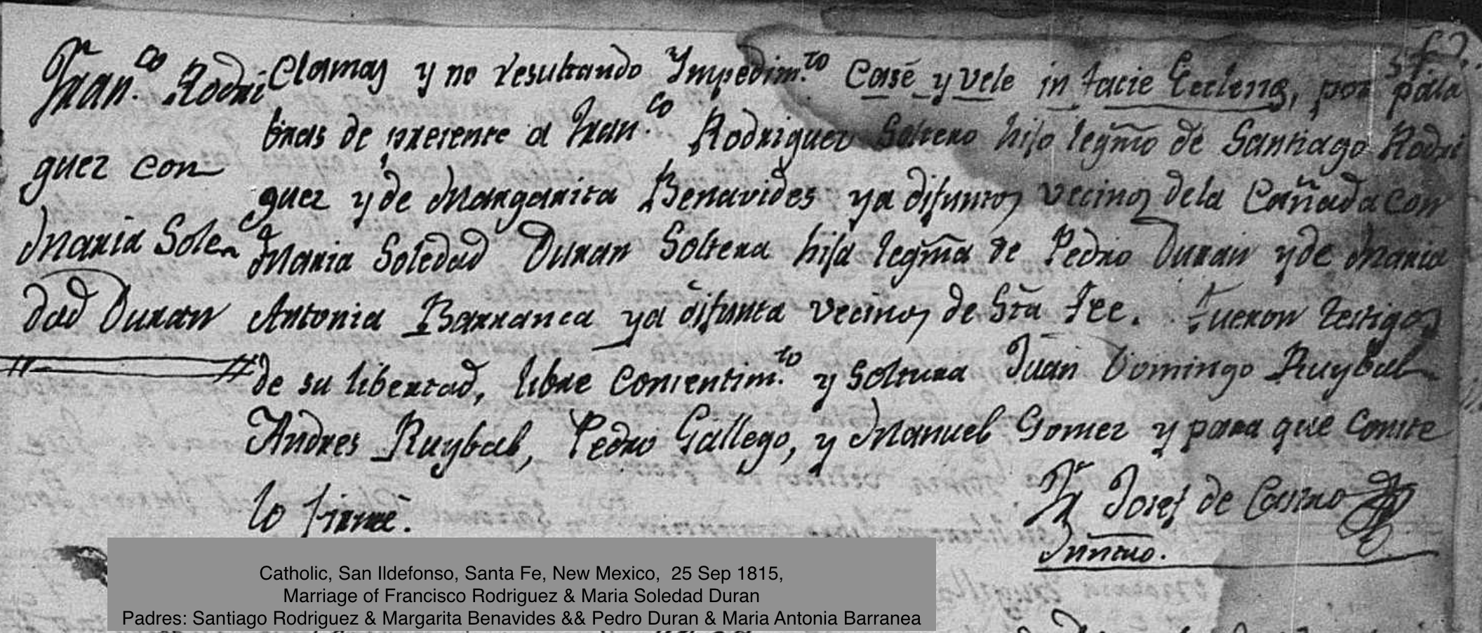 | Marriage | New Mexico Marriages, 1751-1918 For Franco. Rodriguez Event Date: 25 Sep 1815 Event Place: San Ildefonso Pueblo, Santa Fe, New Mexico, United States Event Place (Original): Catholic, San Ildefonso, Santa Fe, New Mexico, United States Spouse's Name: Maria Soledad Duran Parents: Santiago Rodriguez & Margarita Benavides && Pedro Duran & Maria Antonia Barranca |