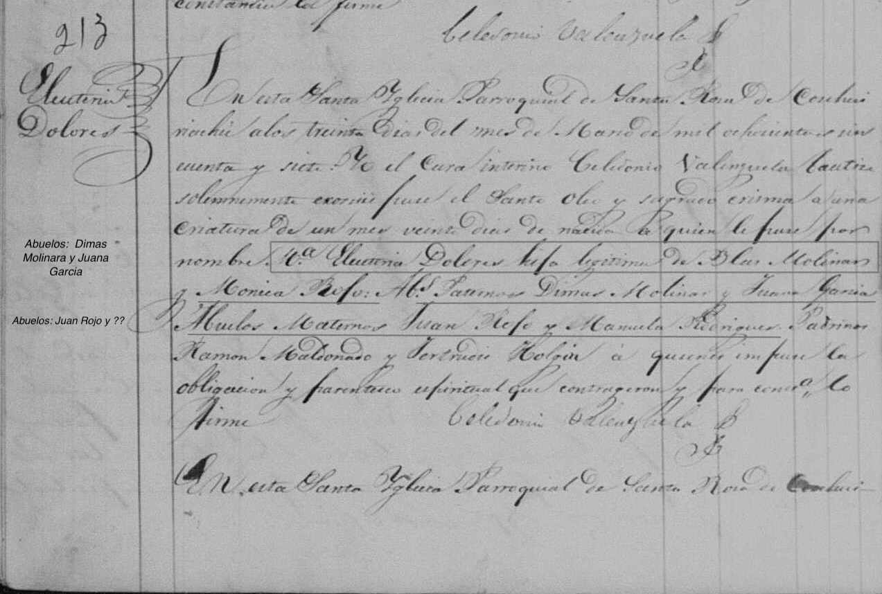 | Baptism | Mexico, Select Baptisms, 1560-1950 For Maria Eleuteria Dolores Molinar Rojo Gender: Female Baptism Date: 30 mar. 1857 Baptism Place: San Antonio DE Cuauhtemoc,Cusihuiriachic,Chihuahua,Mexico Father: Blas Molinar Mother: Monica Rojo FHL Film Number: 162462 |