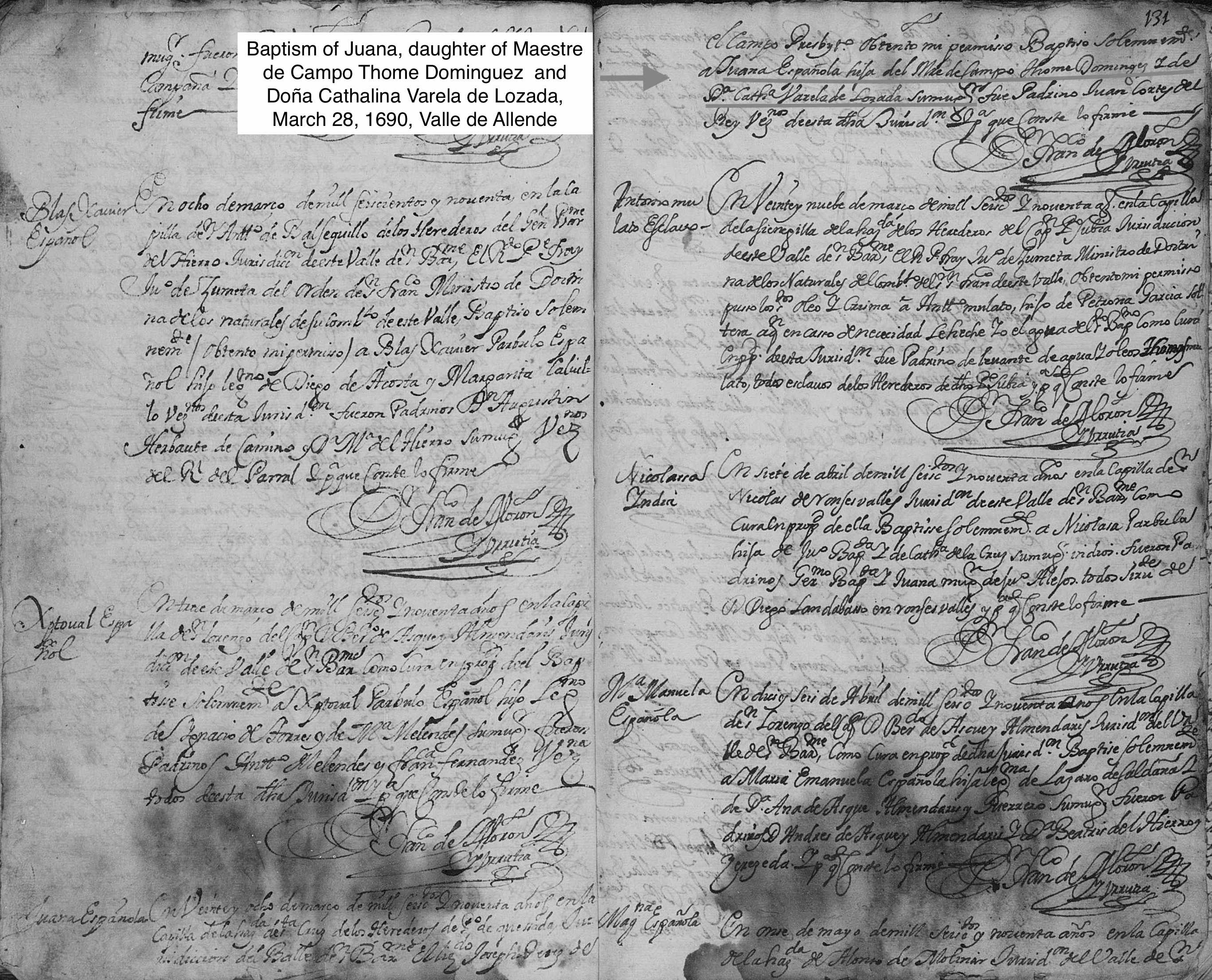 Juana DOMINGUEZ de VARELA Baptism: March 28, 1690 67 — San Bartolome, Valle De Allende, Chihuahua, Mexico |