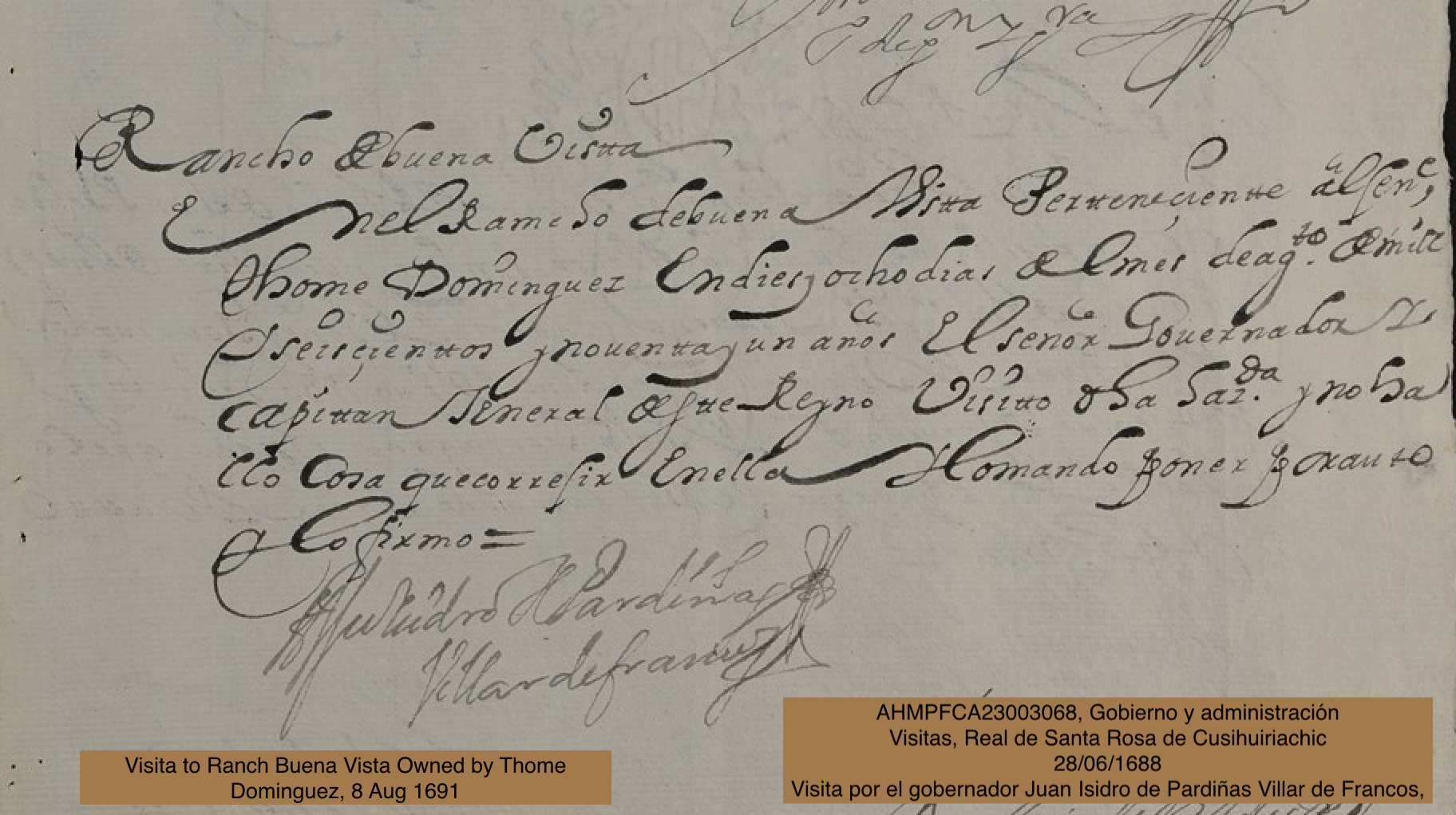 | Property | AHMPFCA23003068 Gobierno y administración Visitas Real de Santa Rosa de Cusihuiriachic 28/06/1688 Visita por el gobernador Juan Isidro de Pardiñas Villar de Francos, Owned by Tomé Dominguez. Not sure if this is the old Maestre de Campo Tomé or, perhaps, a nephew named Tomé. |