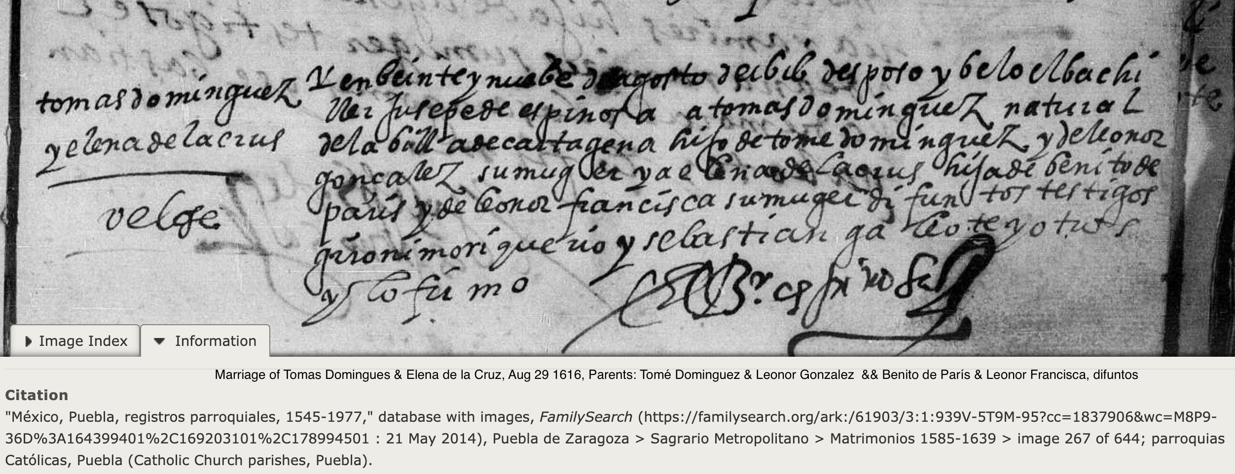 | Marriage | Mexico, Select Marriages Index, 1556-1989 For Tomas Dominguez Gender: Male Marriage Date: 29 ago. 1616 (29 Aug 1616) Marriage Place: Sagrario Metropolitano,Puebla de Zaragoza,Puebla,Mexico Spouse: Elena De La Crus FHL Film Number: 227701 Tomas Dominguez, natural de Cartagena Parents: Tomé Dominguez & Leonor Gonzales && Benito de París & Leonor Francisca |
