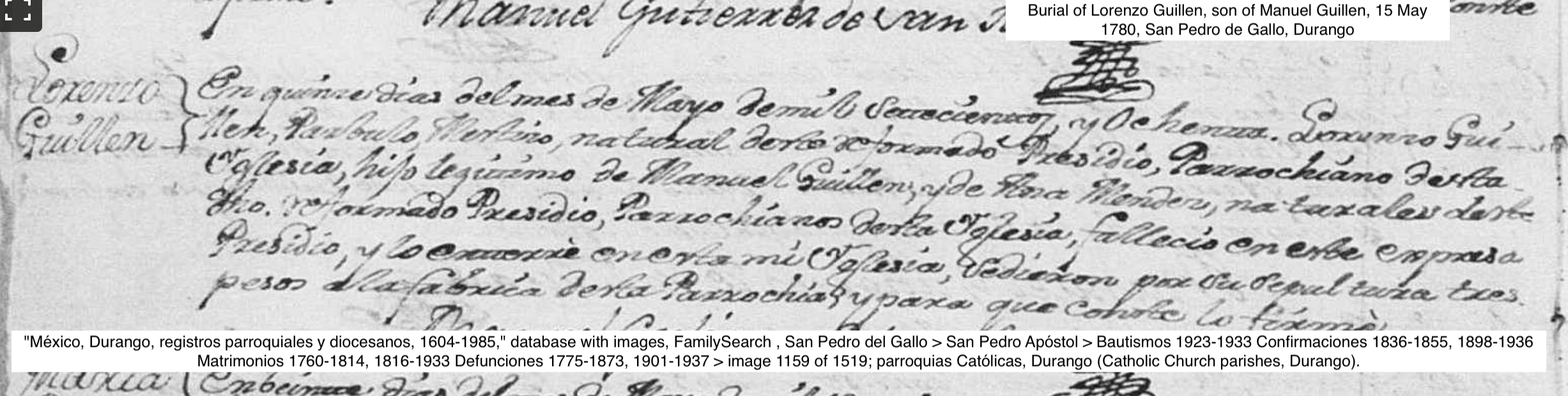 Lorenzo GUILLEN Birth: about 1780 50 Death: May 15, 1780 — San Pedro del Gallo, Durango, Mexico |
