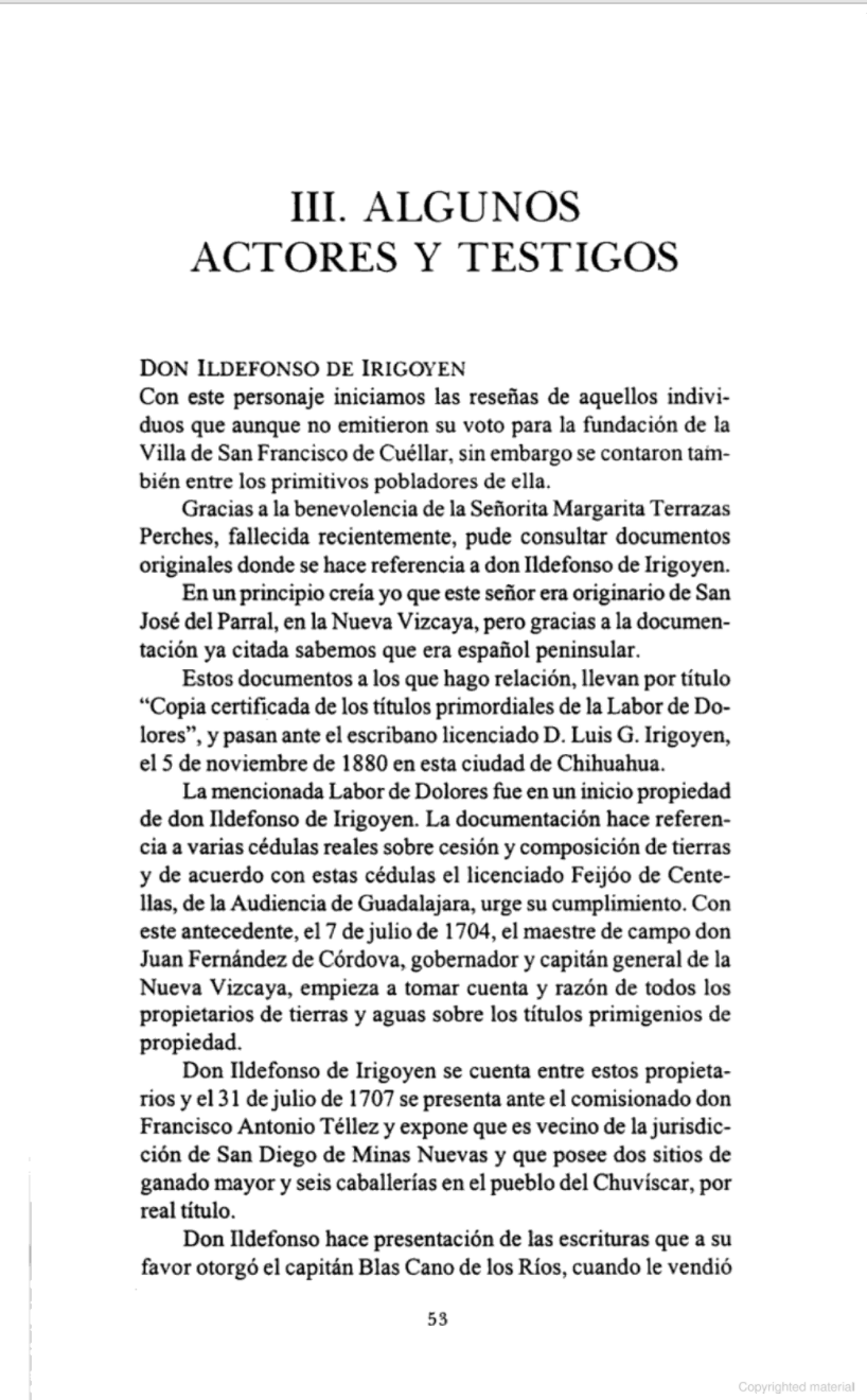 Property | about 1710 (Age 63 years) Note: Don Ildefonso de Irigoyen owned many pieces of property in and around the modern city of Chihuahua. One of the largest he acquired from Blas Cano de los Rios, son of Diego Cano de los Rios. (Also our ancestor).