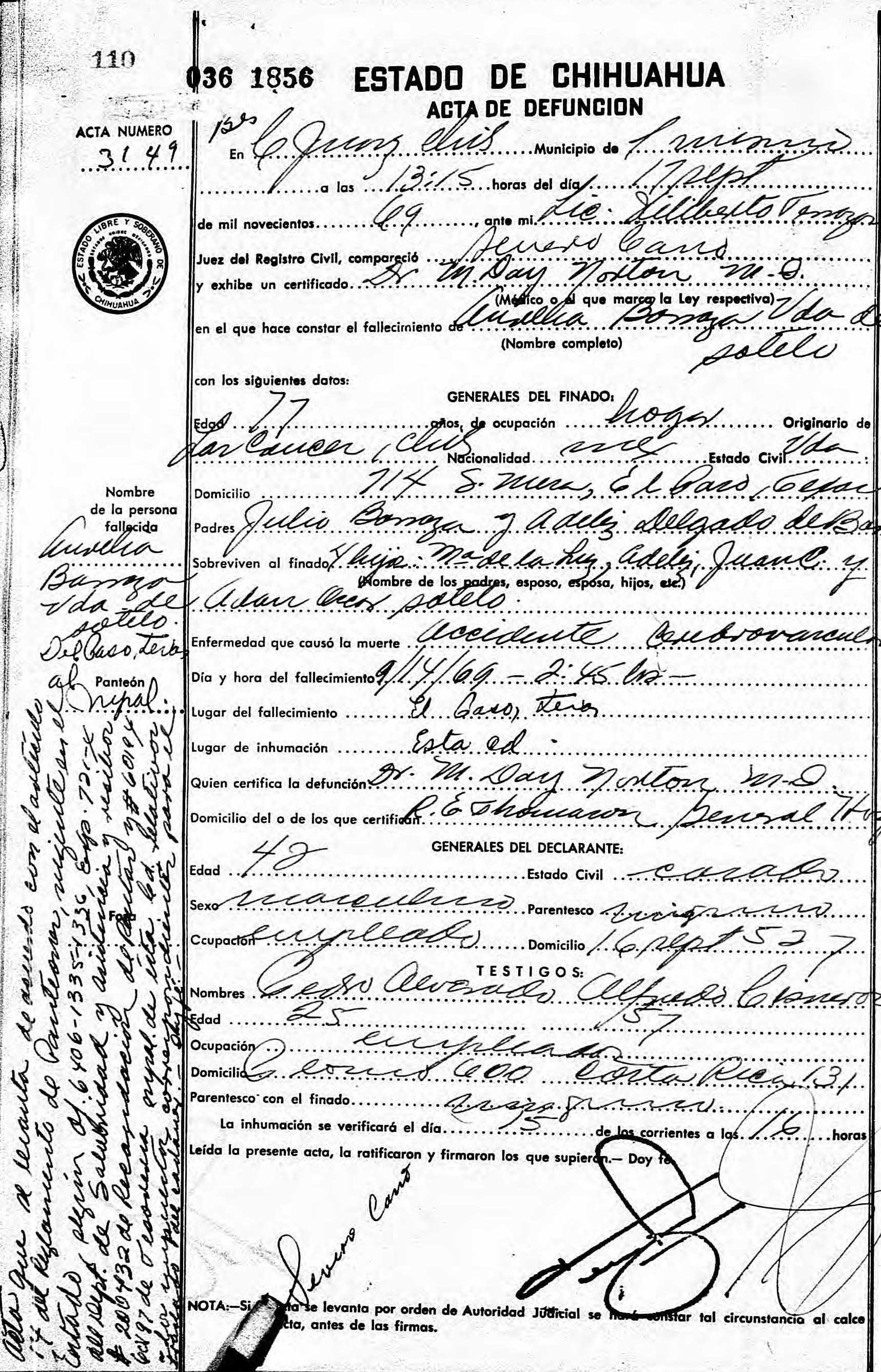 Baptism: February 19, 1894 25 — Inmaculada Concepción, Galeana, Chihuahua, Mexico Death: October 30, 1963 — Cruces, Chihuahua, Mexico |