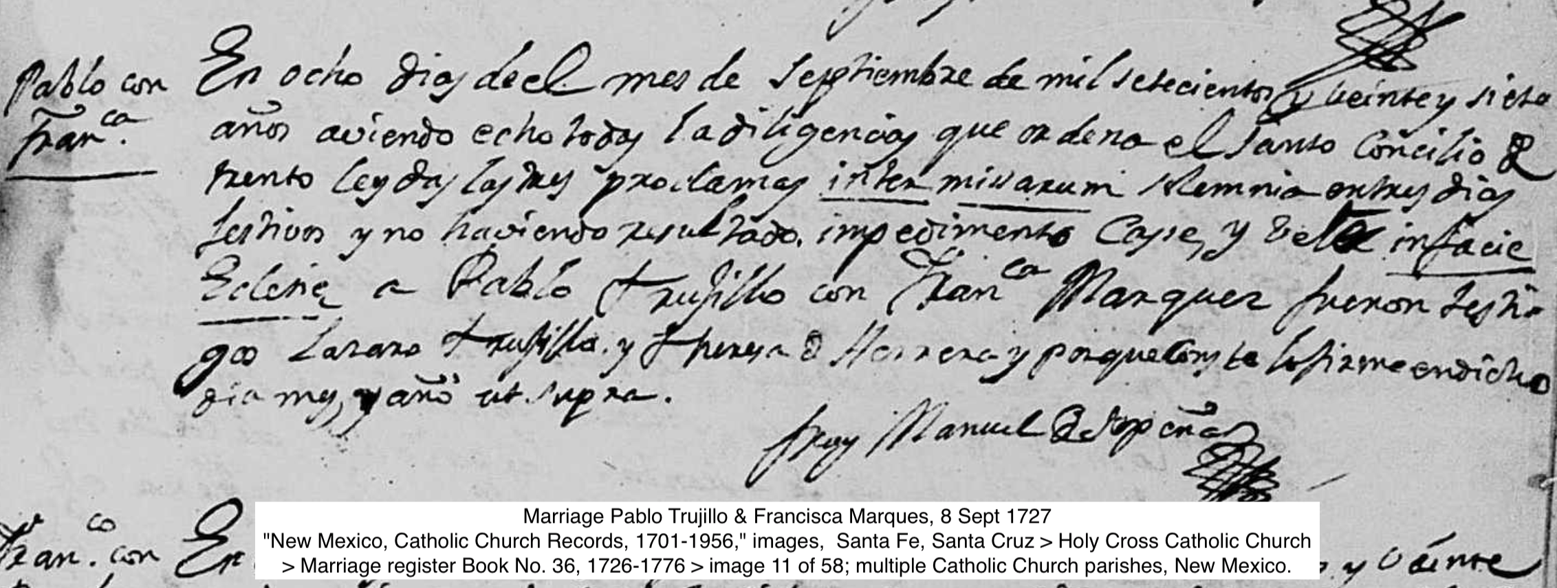 | Marriage | Baltazar's known children by his wife Nicolasa de la Cruz Espinosa were: María, born 29 Dec 1704 and Pablo Manuel, 31 Jan 1709, who married Francisca Márquez at Pojoaque in Sep 1728. Baltazar Trujillo resided at Pojoaque in 1710 when he declared himself to be a native of New Mexico and forty years old. He belonged to the Conquistadora Confraternity. He purchased lands in Taos which he sold back to the original owner around the year 1725. As a "widower of Pojoaque," Baltasar married "Ynez, widow of Albuquerque," on May 8 May 1728. He and this Ynez González Bas were sponsors together in 1739. He died at Pojoaque, 17 Jun 1740. |