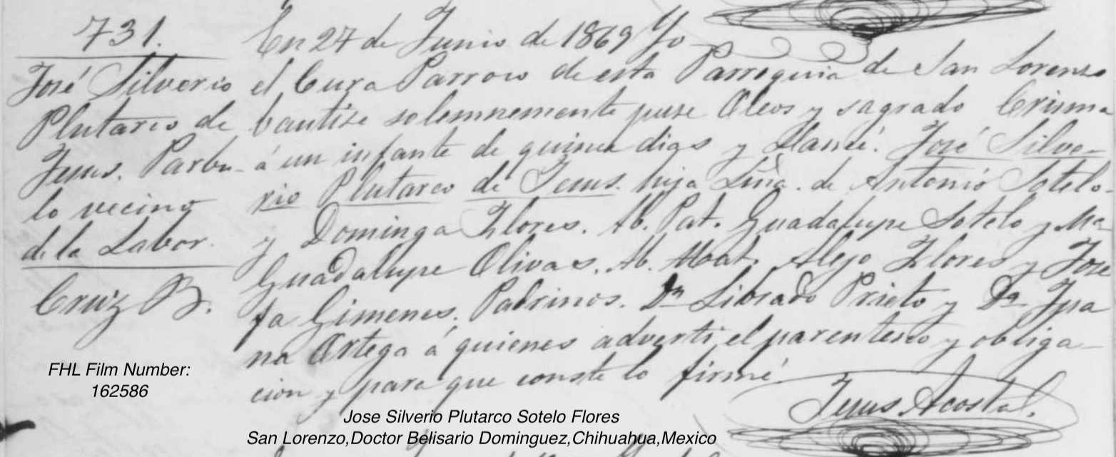 Jose Silverio Plutarco SOTELO Baptism: June 27, 1869 42 40 — San Lorenzo, Doctor Belisario Dominguez, Chihuahua, Mexico |