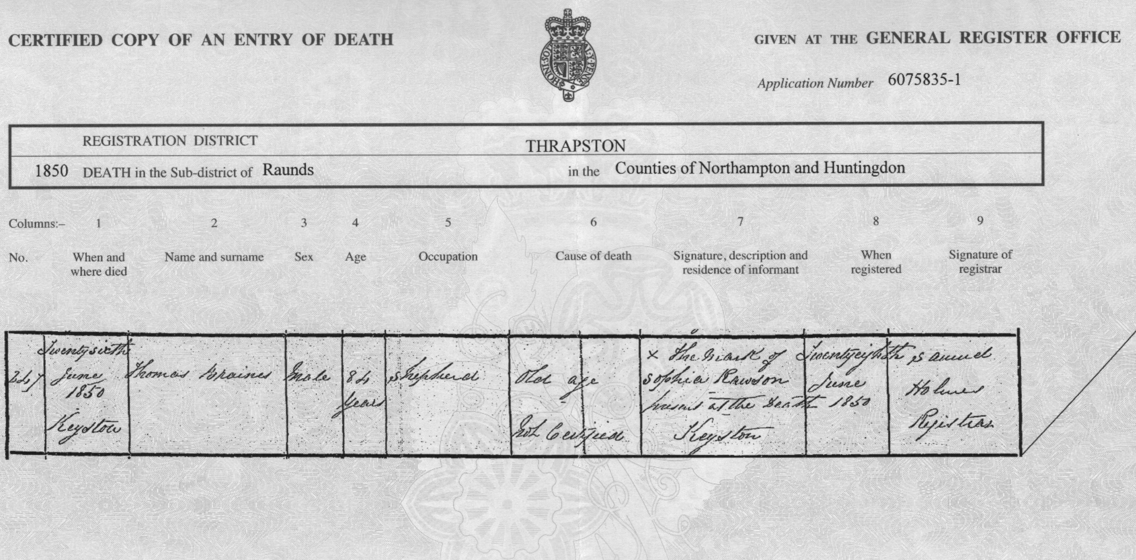 Death of a paternal grandfather | Thomas BRAINES June 26, 1850 (Age 19 years) Age: 84 Note: GRO Record: Thomas Braines, age 84, Shepherd, died Keyston, witnessed by Sophia Rawson, Reg District Thrapston, Subdistrict Raunds, Huntingdonshire. Burial record in Keystone Parish stated: Thomas Braines, age 84, Abode Keystone, Buried Jun 28, 1850. SOG HU/R 38