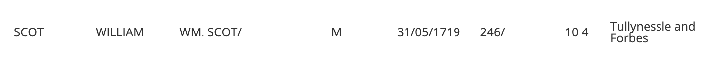 William SCOTT Birth: May 29, 1719 — Balfour, Tull OF Forbes, Scotland |