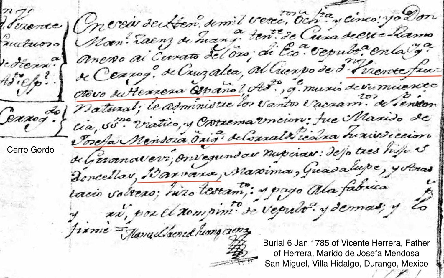 Visente Fructoso de HERRERA Birth: Corral de Piedras, Jurisdition of Guanaveri, (near Parral Burial: January 6, 1785 — San Miguel, Villa Hidalgo, Durango, Mexico |