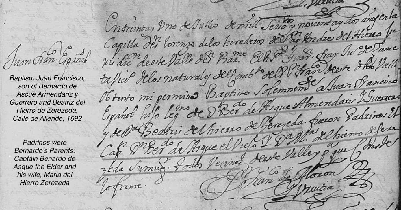 Juan Francisco de ASCUE ARMENDARIZ y HIERRO Baptism: July 31, 1692 20 — San Bartolome, Valle De Allende, Chihuahua, Mexico |
