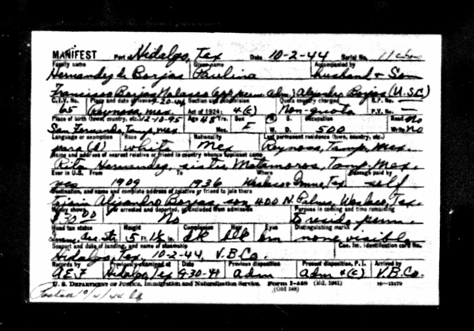 Paulina HERNANDEZ Birth: December 10, 1895 — San Fernando De Presas, Tamaulipas, Mexico Death: February 8, 1978 — Hidalgo Co, Tx |