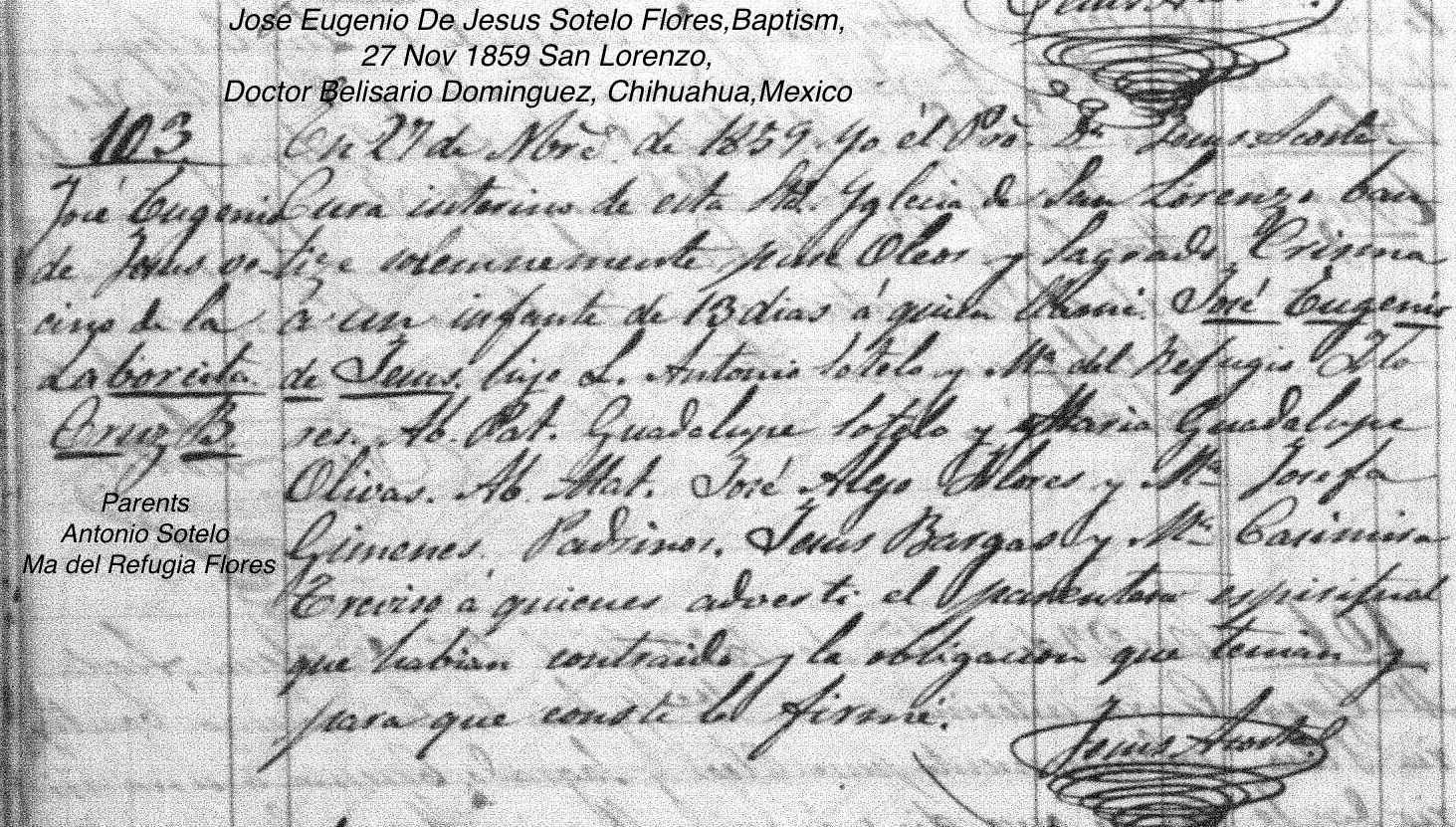 Jose Eugenio de Jesus SOTELO Baptism: November 27, 1859 32 30 — San Lorenzo, Doctor Belisario Dominguez, Chihuahua, Mexico |