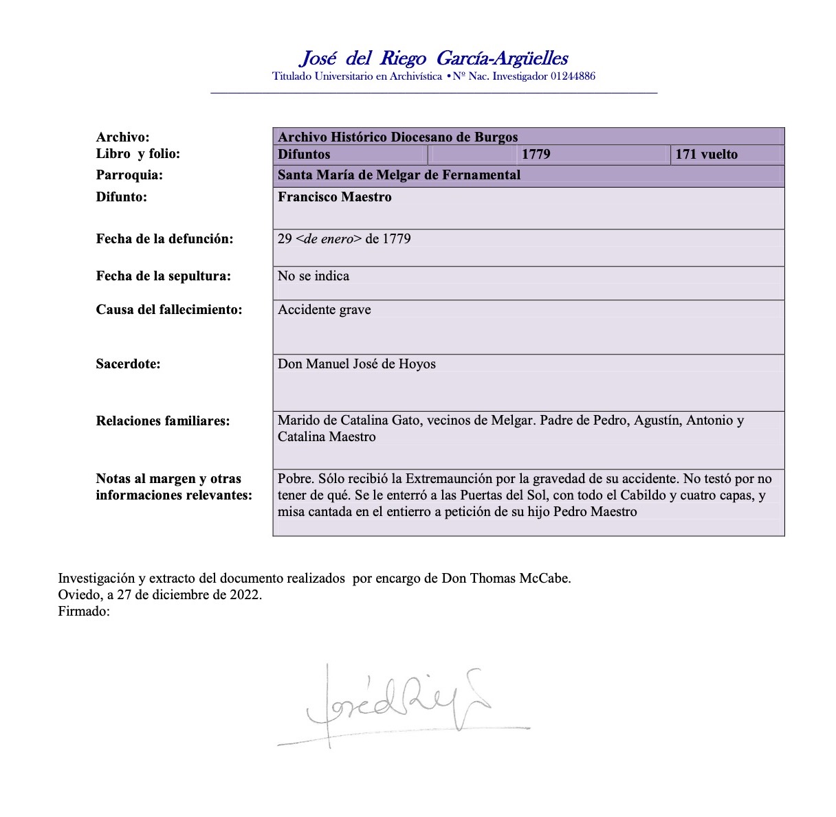 Francisco MAESTRO ERRANTE Death: January 29, 1779 — Diocesano de Burgos, España |