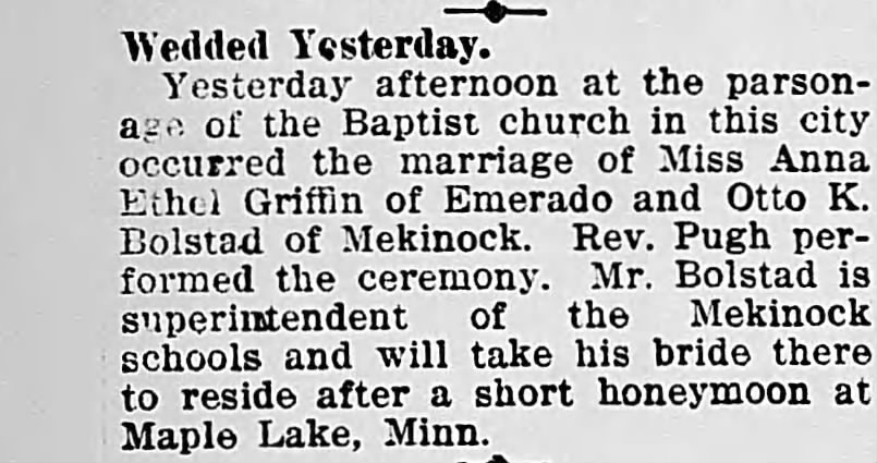 Marriage: July 26, 1911 — Grand Forks, North Dakota, USA |