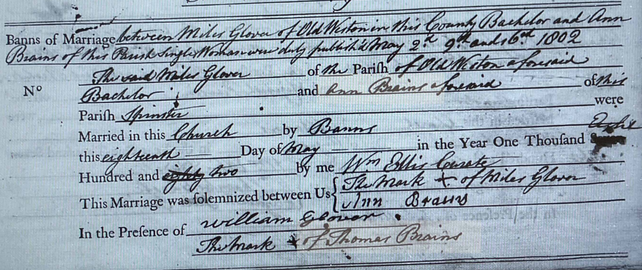 Marriage | Miles GLOVER — View this family May 18, 1802 (Age 25 years) Note: The marriage record from the parish in Keystone states Ann was an unmarried resident of Keystone but Miles Glover was a resident of Old Weston Hunts. Thomas Braines was a witness at the wedding.
