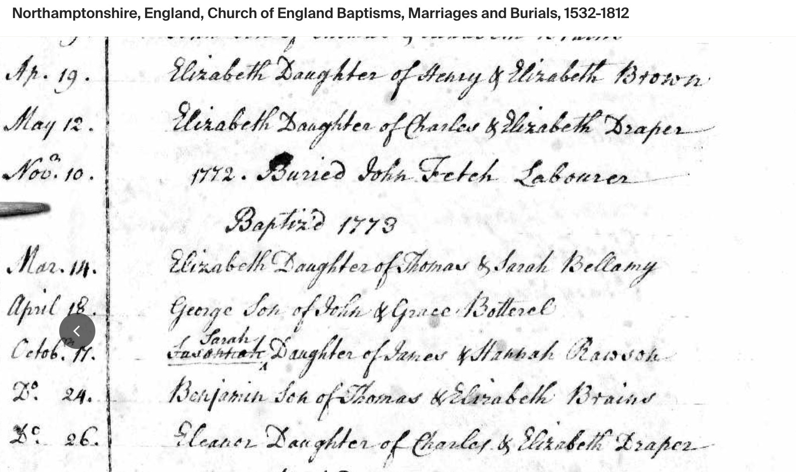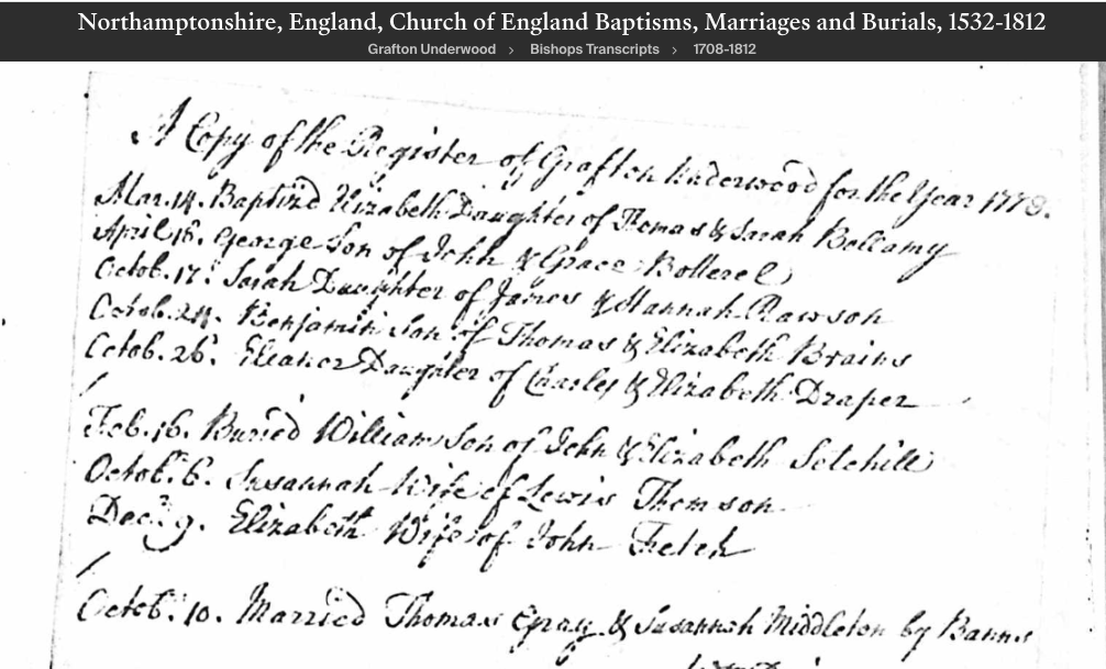 Elizabeth BRAINES Birth: June 3, 1770 — Grafton Underwood, Northamptonshire, England |