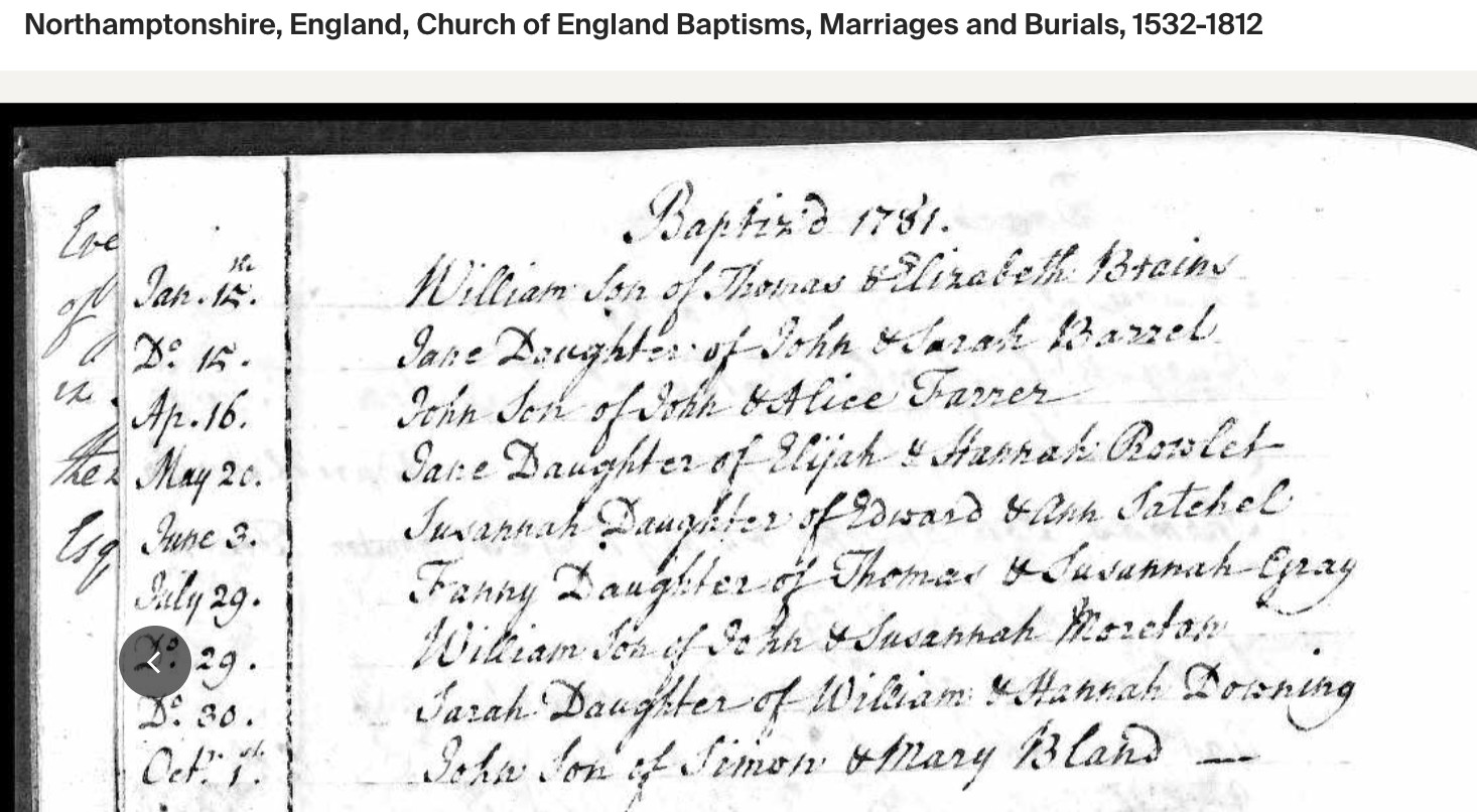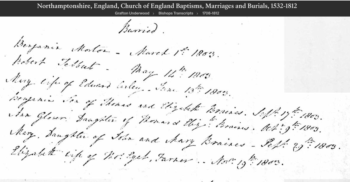 Jane BRAINES Death: December 1785 — Grafton Underwood, Northamptonshire, England |