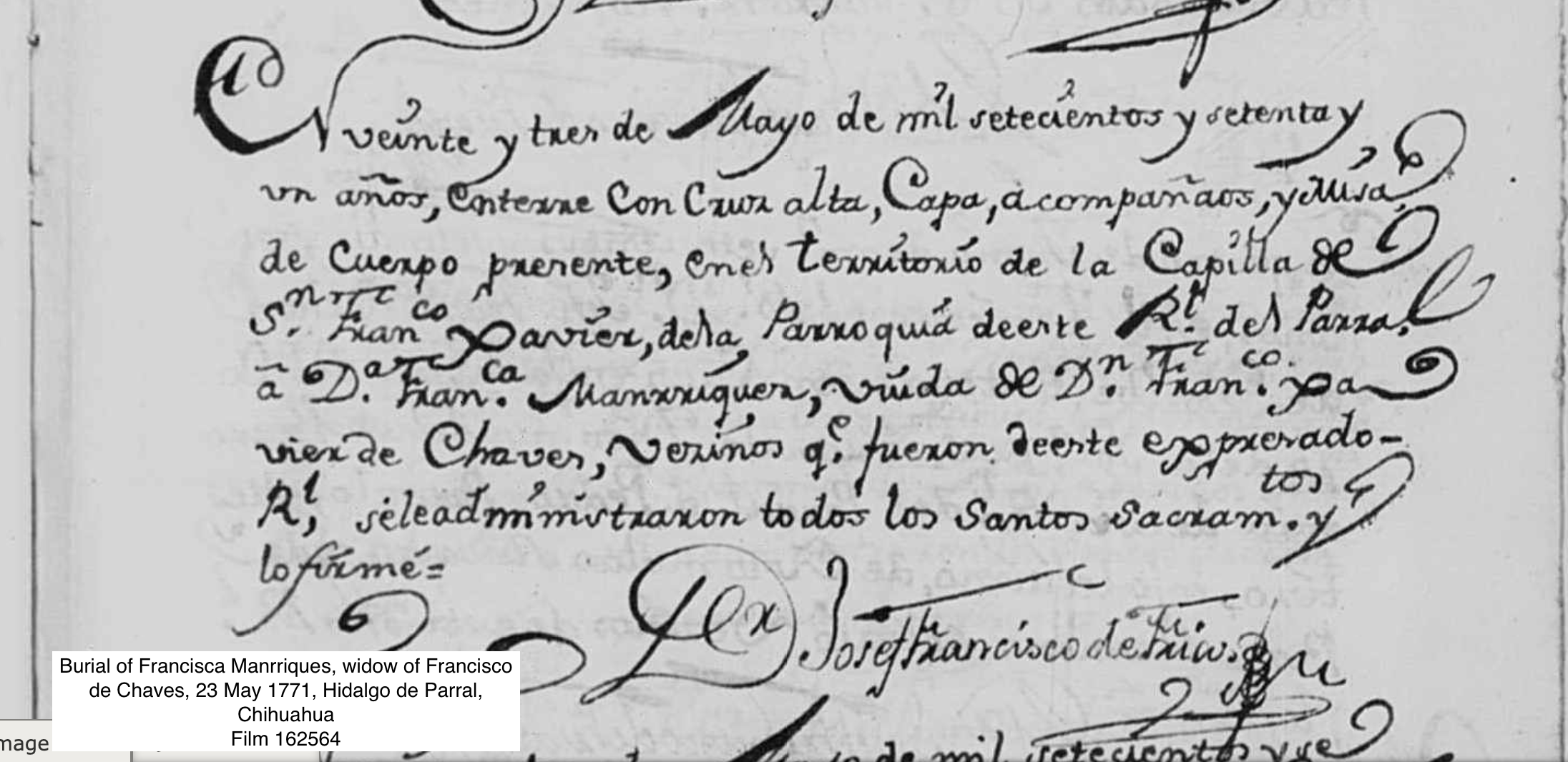 Francisca Teresa MANRIQUEZ Birth: about 1703 32 — Chihuahua, Mexico (Probably) Death: May 23, 1771 — Hidalgo del Parral, Chihuahua, Mexico |