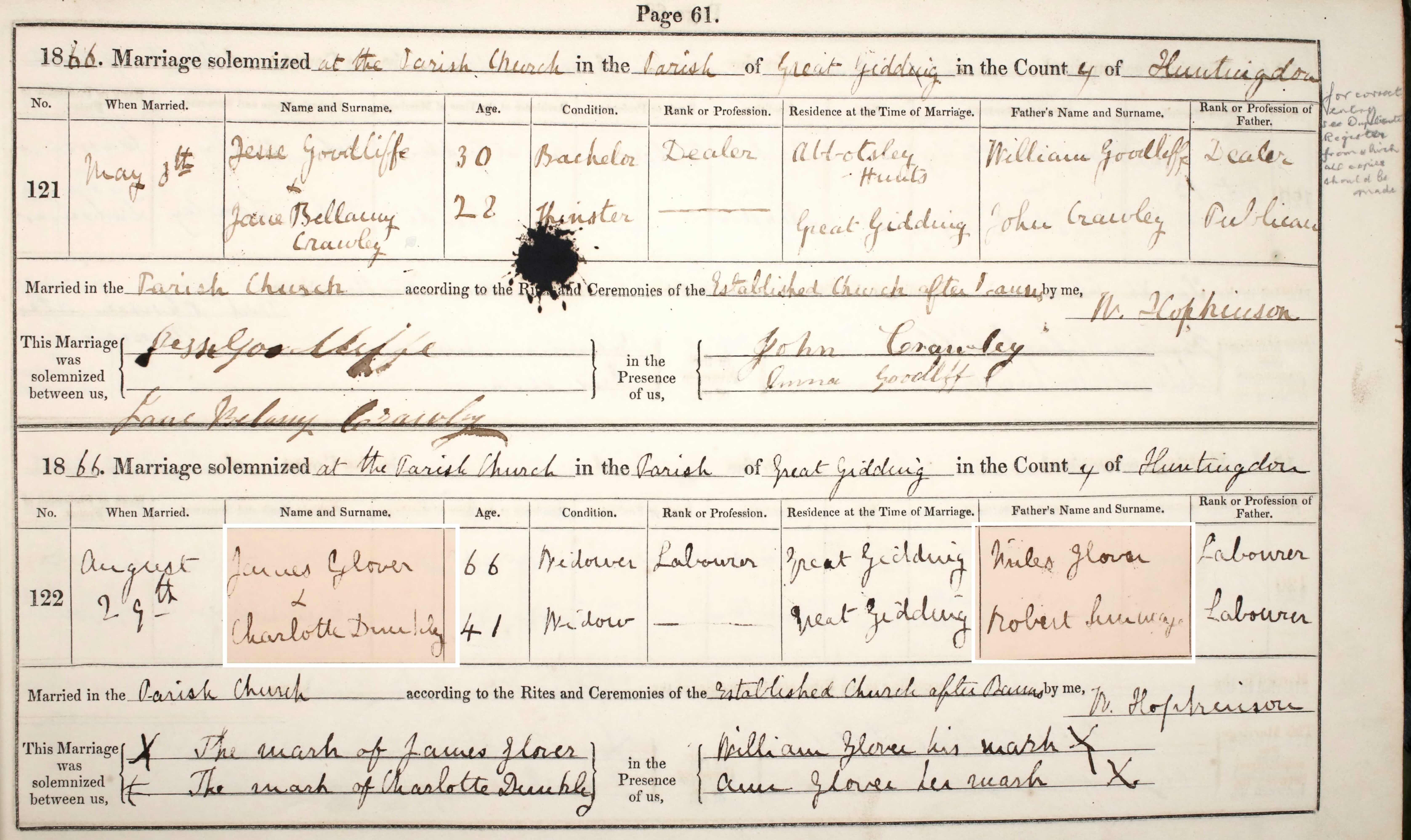 | Note | in the Cambridgeshire and Huntingdonshire, England, Church of England Marriages and Banns, 1754-1950 Name James Glover Marriage Age 66 Marriage Date 29 Oct 1866 [1866 August 29] Marriage Place Great Gidding, Huntingdonshire, England Father Miles Glover Spouse Charlotte Dunkley Parish as it Appears Great Gidding Page number 61 |