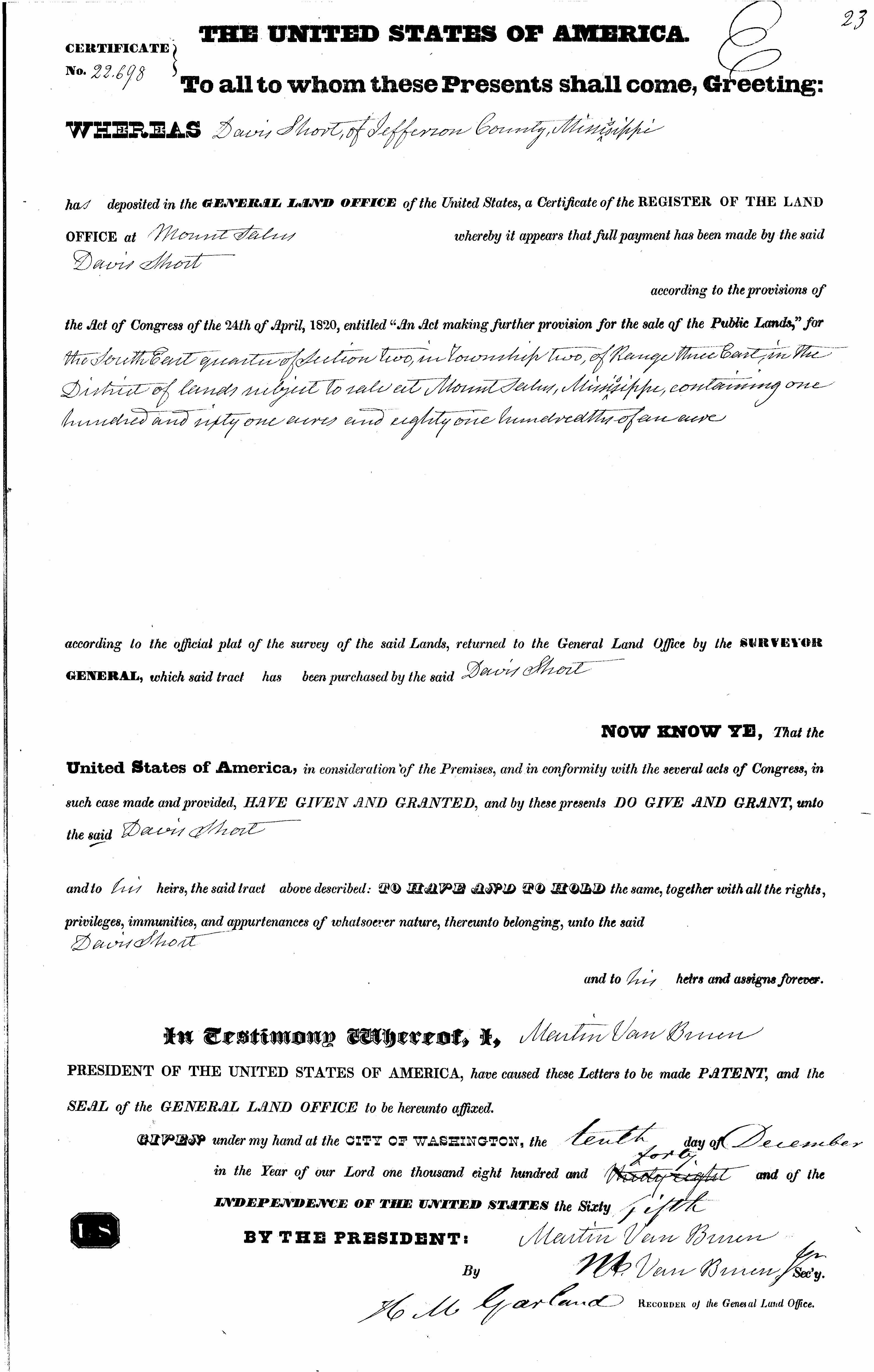 Davis SHORT Birth: December 6, 1792 22 — Georgia, USA Death: September 1, 1865 — Jefferson Co, Mississippi |