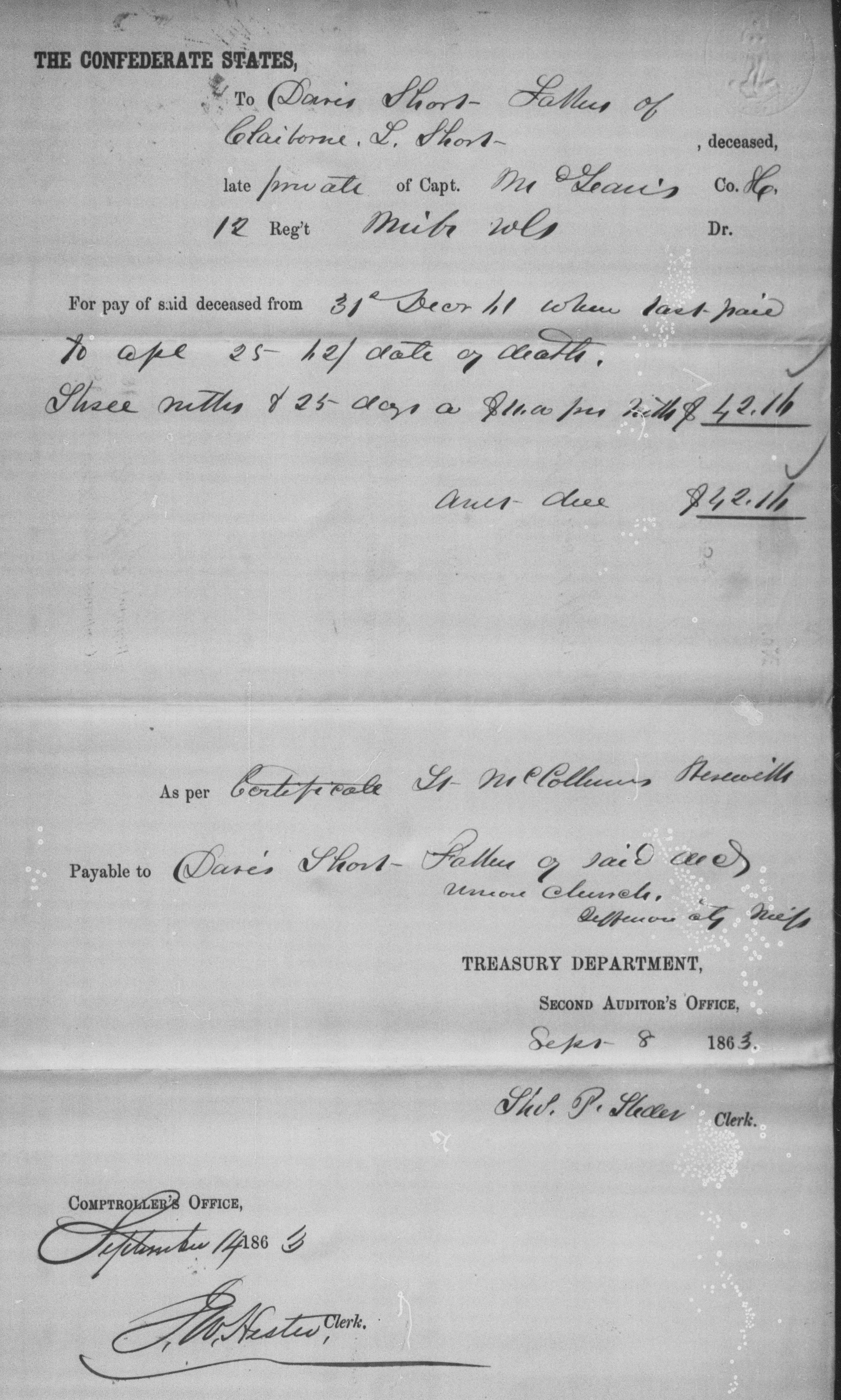 Fact | Confederate Payment Note: Davis Short's son Claiborne died while serving as Confederate soldier in the Mississippi Volunteers.