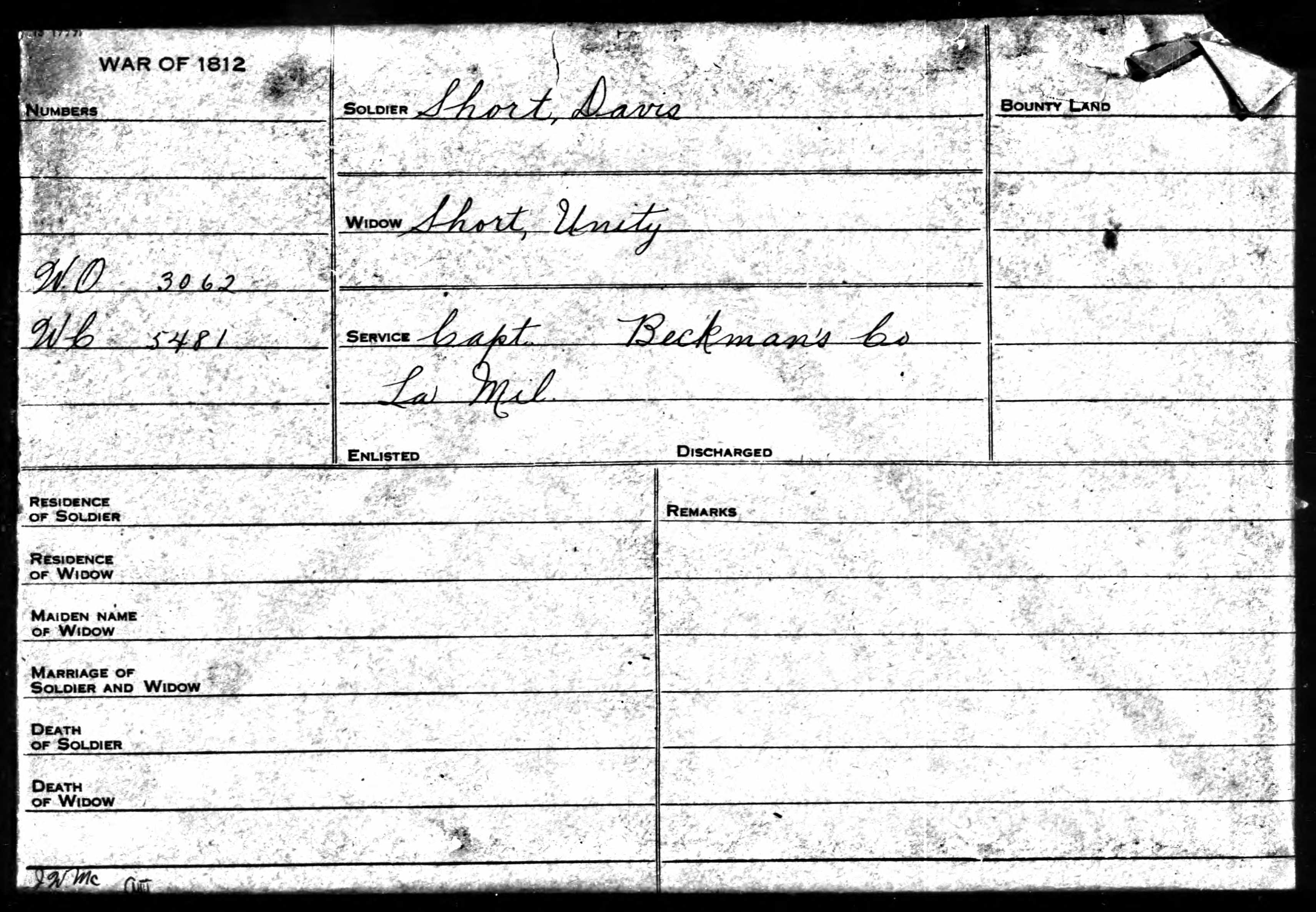 | Census | Davis Short 58 Unity Short 55 Mary Ann Short 80 (Mother) Andrew J Short 19 Franklin Huffman 27 Sarah J Huffman 14 Claiborne L Short 13 (Died in Civil War) |