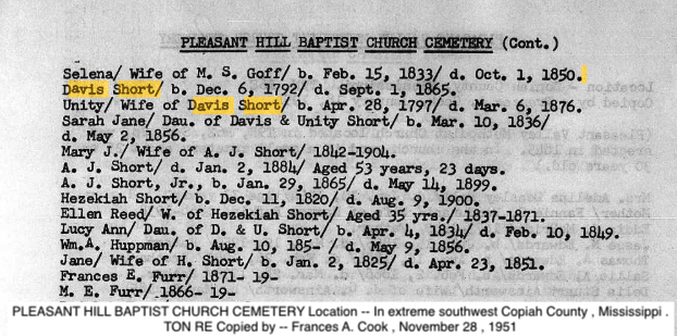 Davis SHORT Birth: December 6, 1792 22 — Georgia, USA Death: September 1, 1865 — Jefferson Co, Mississippi |