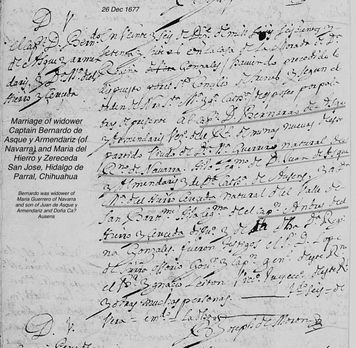 | Marriage | Marriage record shows Bernardo was a widower of Maria Guerrero of Navarra and was the son of Juan Asque y Armendariz and his wife Doña C Ausens. |