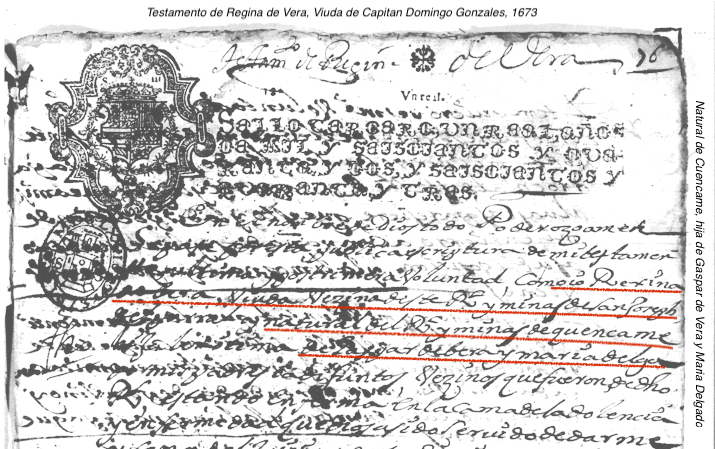 Death of a mother | Regina de VERA June 2, 1673 (Age 34 years) Page 1 of Regina de Vera's Will, 1673 Note: On her deathbed Regina de Vera declared she is a widow, a native of Cuencame and her parents were Gaspar de Vera & Maria Delgado.