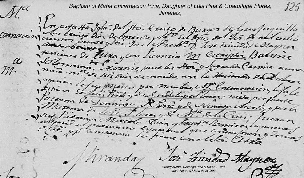Jose Luciano Nicanor PIÑA FLORES Baptism: January 11, 1820 31 — Santo Cristo de Burgos, Jiménez, Chihuahua, Mexico |