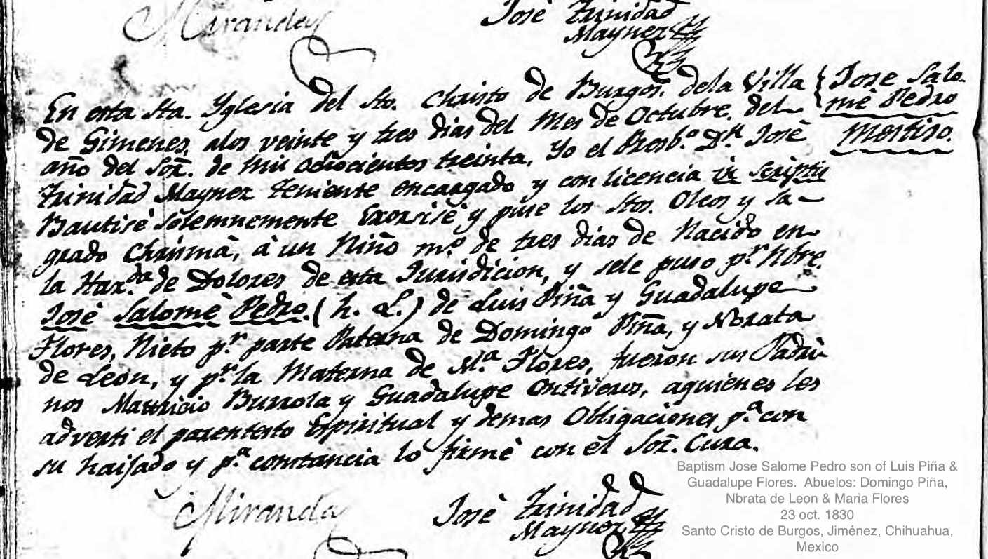 Jose Salome Pedro PIÑA FLORES Baptism: October 23, 1830 42 — Santo Cristo de Burgos, Jiménez, Chihuahua, Mexico |
